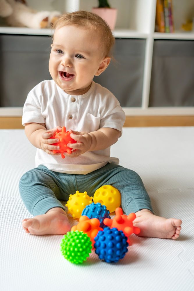 Sada obsahuje 8 barevných míčků. Každá má jiný povrch, jejich hmotnost je jiná a především pestré a rozmanité barvy přitahují pozornost dětí.