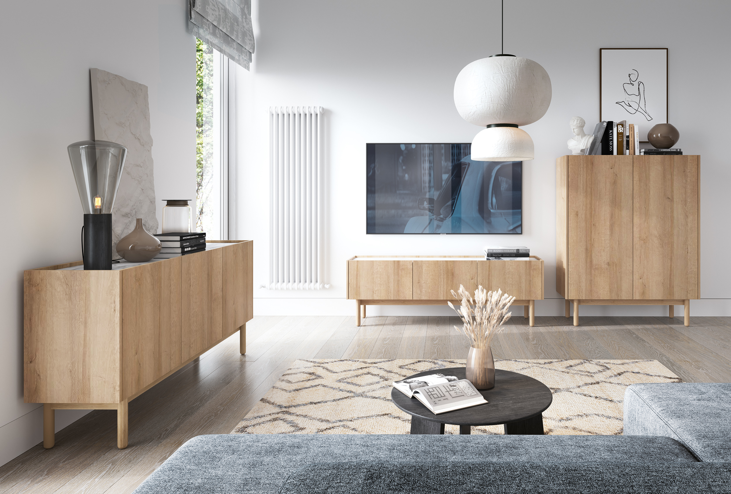 Celá kolekce se skládá ze televizního stolku, tří komod ve dvou velikostech (144 a 97 cm) a nočního stolku.