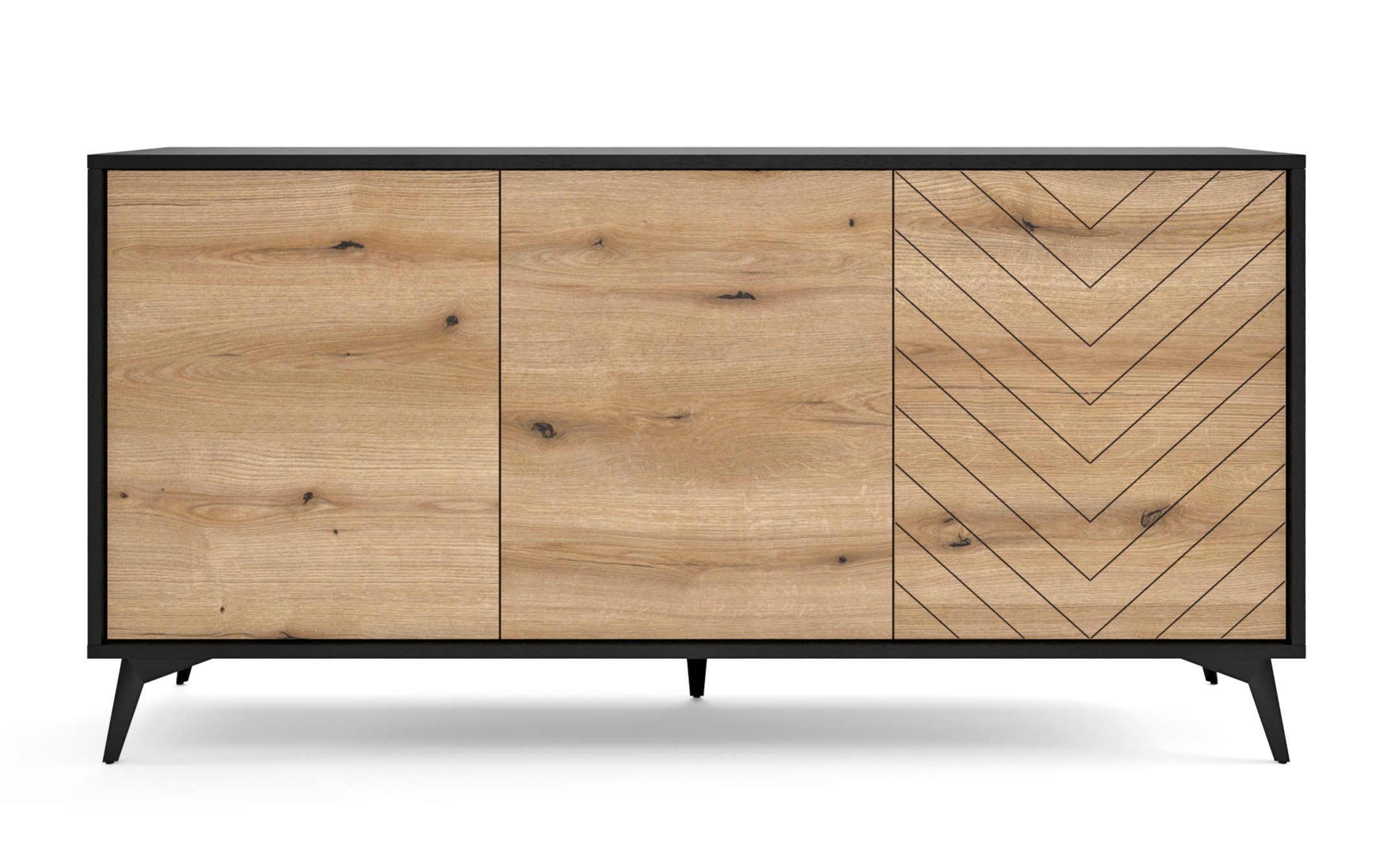 Komoda je široká 154 cm, nabízí dostatek úložného prostoru v podobě tří uzavřených polic za dvířky.