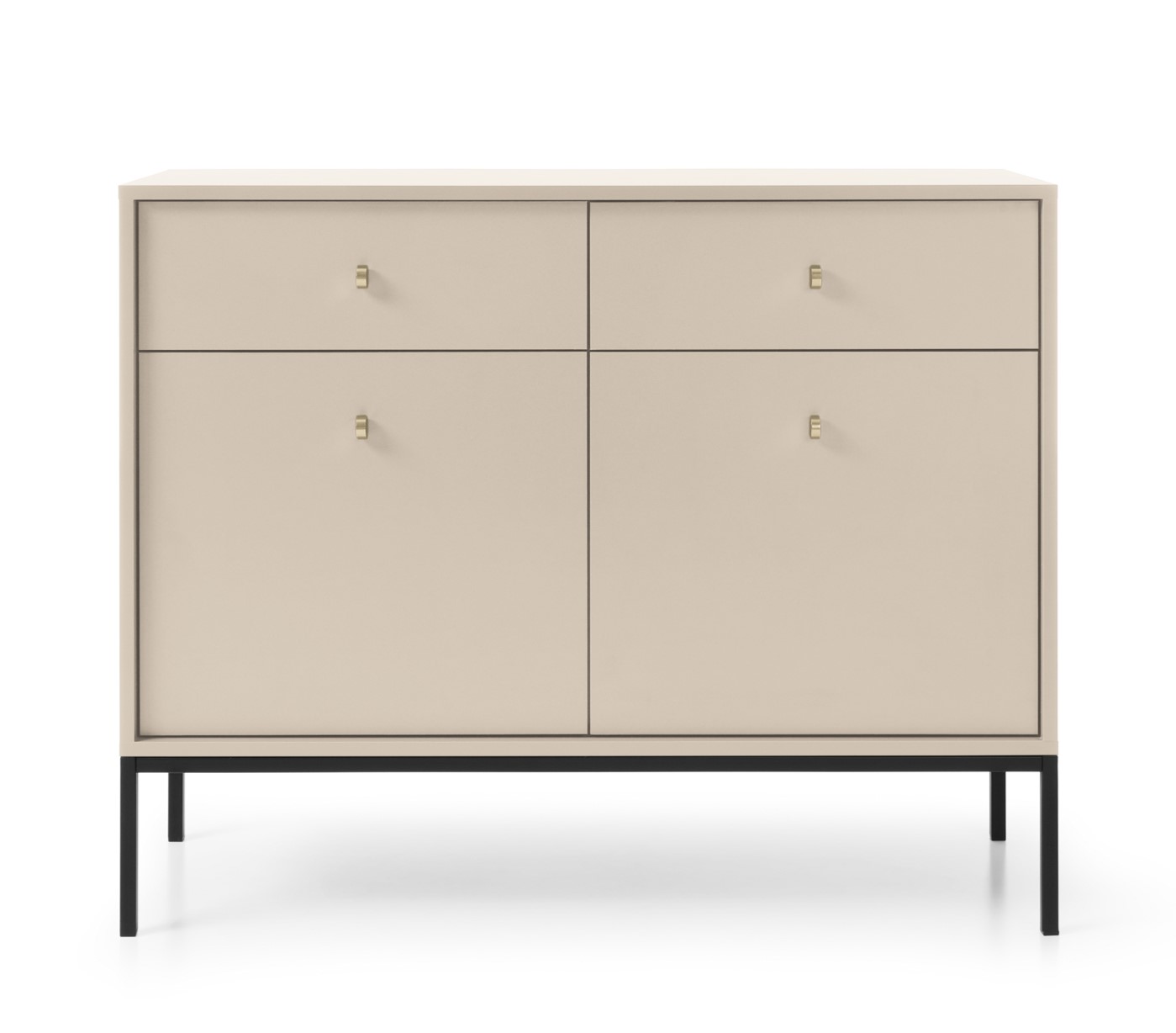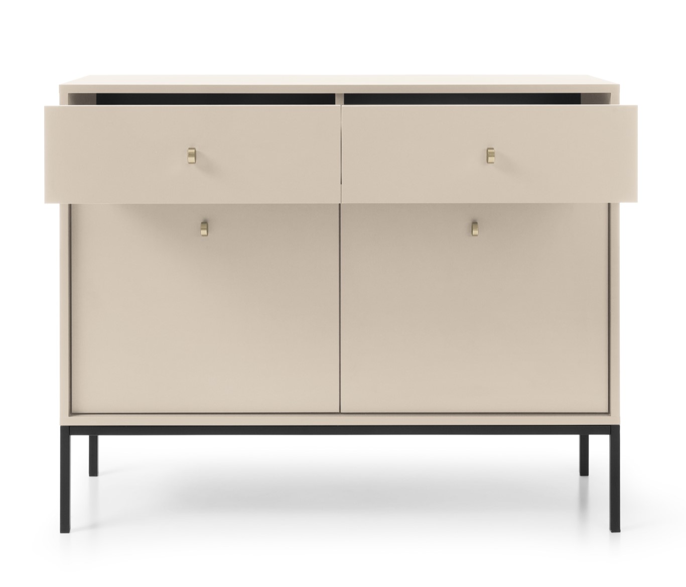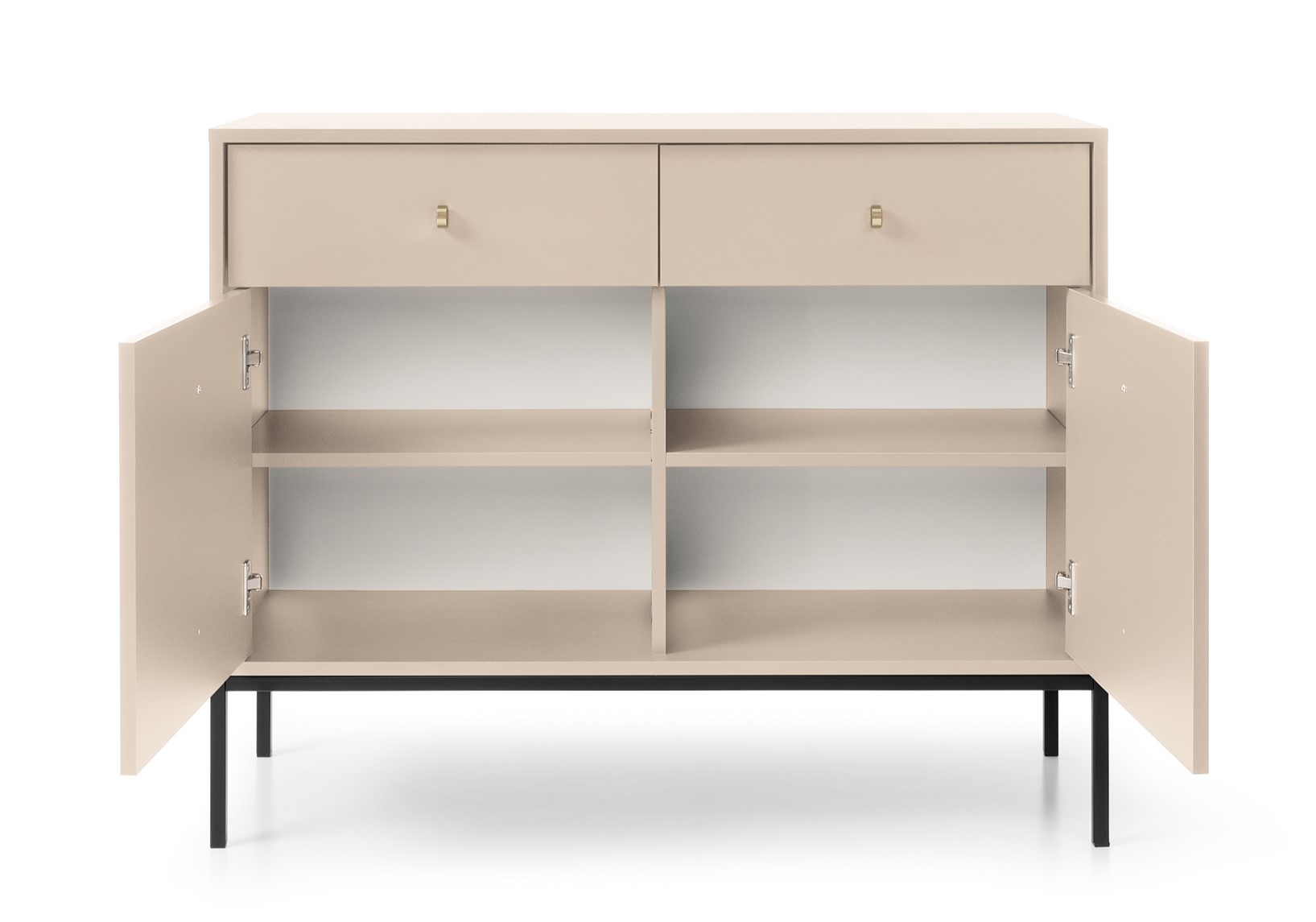 Představte si nejen moderní, ale také funkční kus nábytku, který se stane středobodem Vašeho obývacího pokoje - moderní komoda NOMO. Tento kousek nábytku je dokonalým spojením moderních prvků v dekoru Béžová s vysokými kovovými nohami v černé barvě a se zlatými úchytky ve tvaru knoflíků.