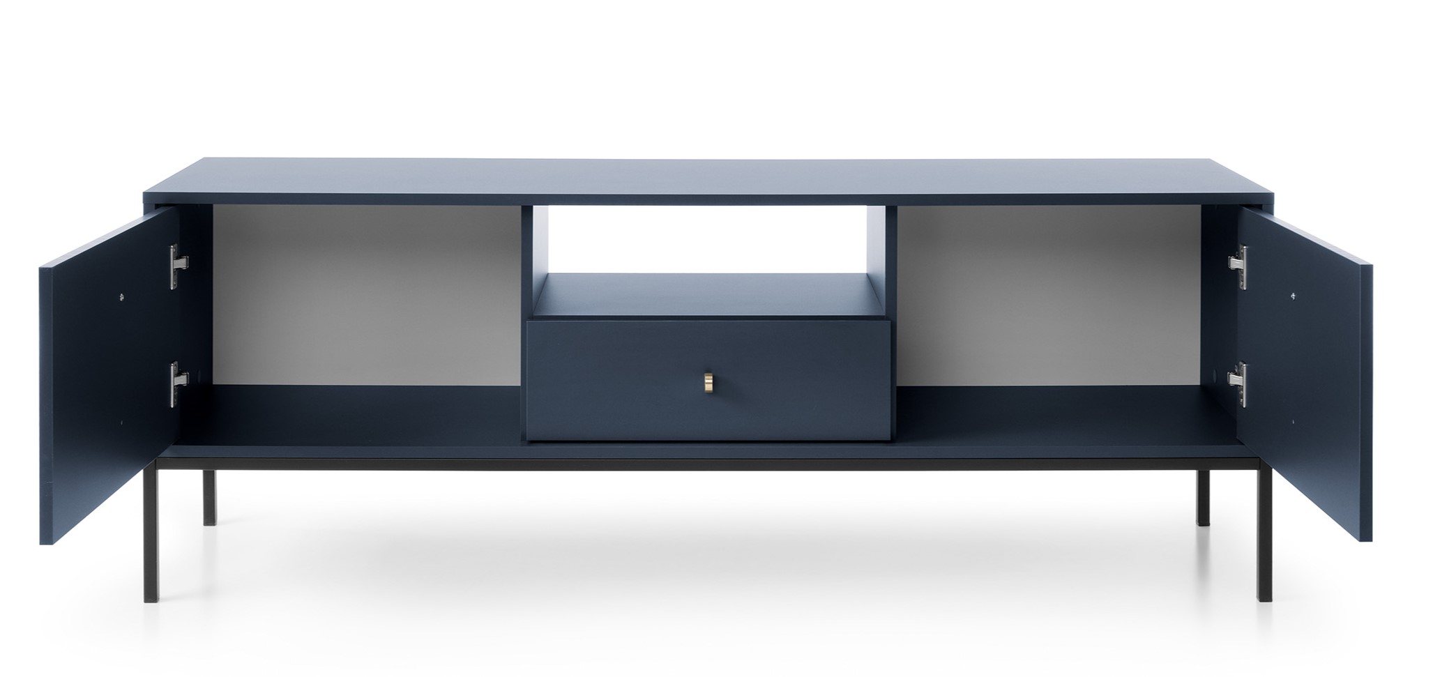 Televizní stolek je široký 154 cm, nabízí dostatek úložného prostoru v podobě tří zásuvek a jedné otevřené police, která může posloužit jako místo pro Váš set-top box, přehrávač nebo herní konzolu.