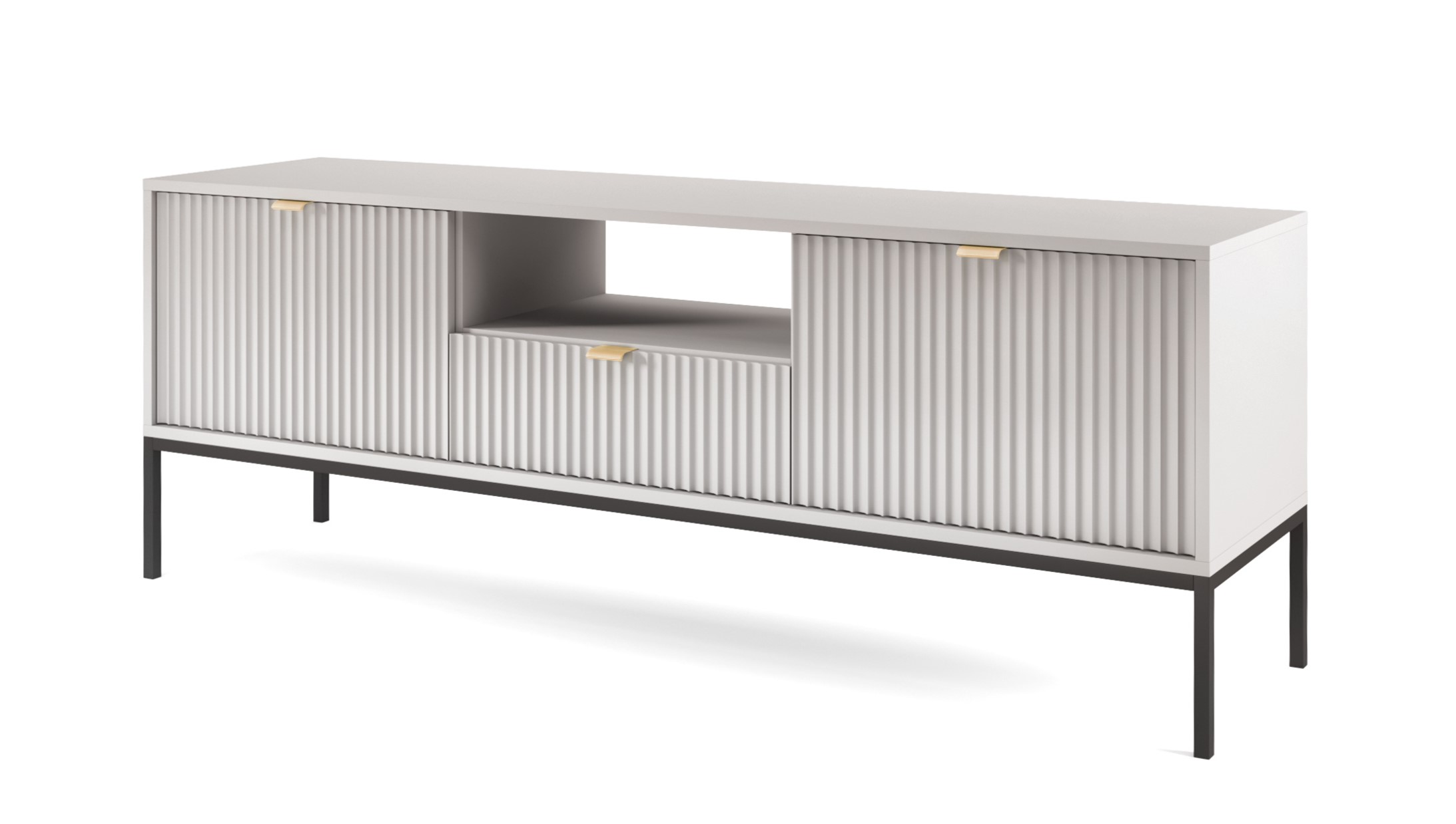 Představte si nejen moderní, ale také funkční kus nábytku, který se stane středobodem Vašeho obývacího pokoje - moderní televizní stolek NEMO. Tento kousek nábytku je dokonalým spojením moderních prvků v dekoru Šedá s vysokými kovovými nohami v černé nebo zlaté barvě se zlatými úchytky.
