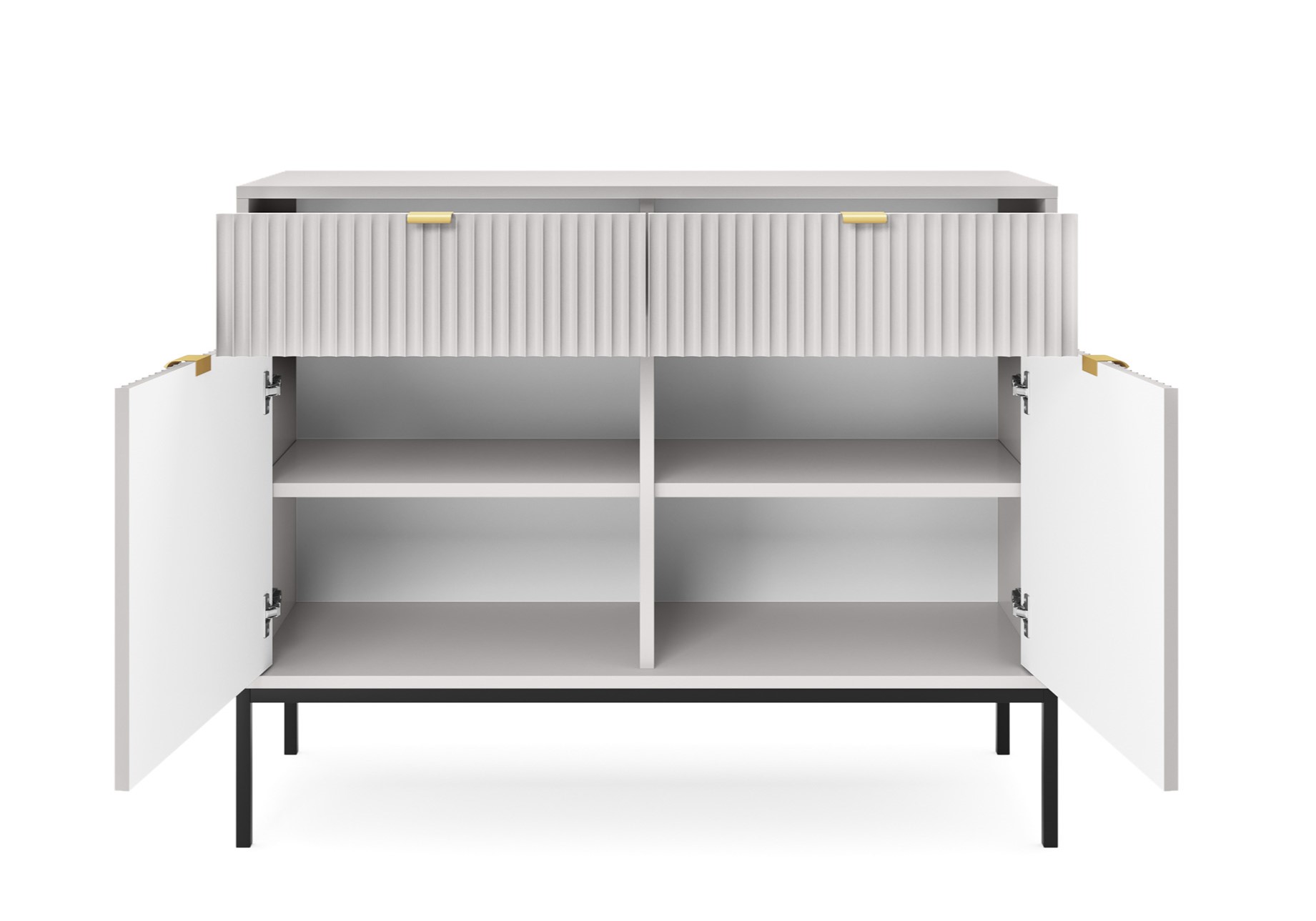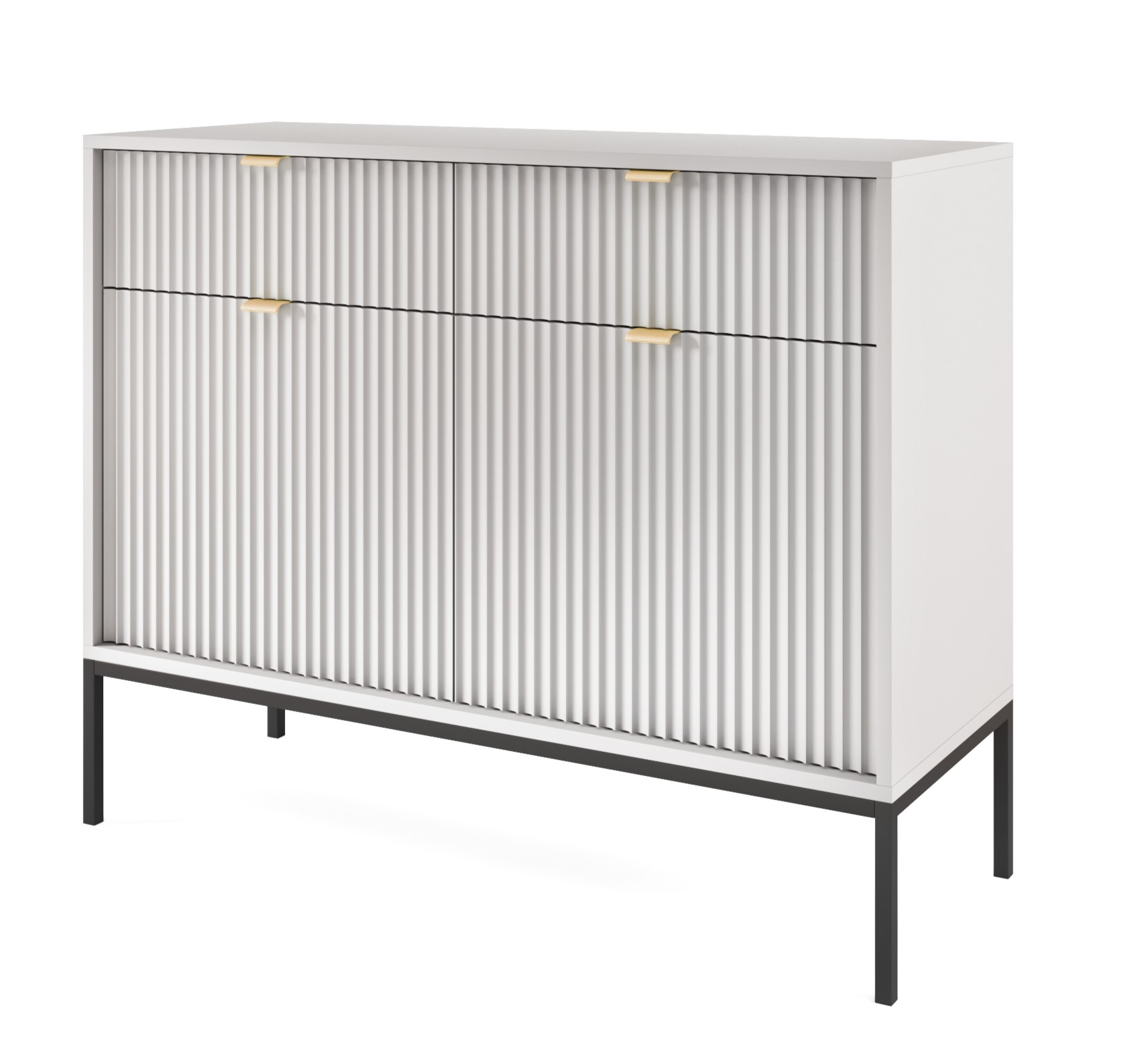 Komoda je široká 104 cm, nabízí dostatek úložného prostoru v podobě dvou zásuvek a dvou uzavřených polic za dvířky.