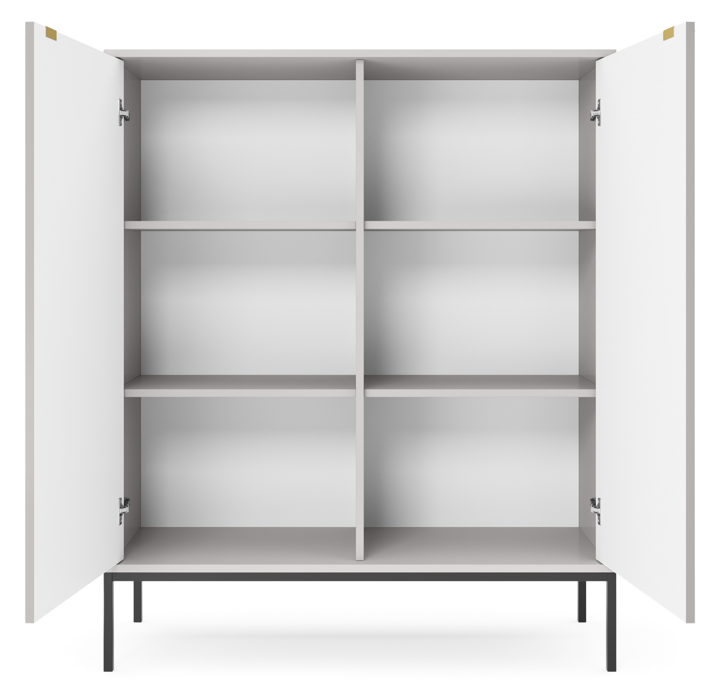 Každý kus nábytku z kolekce NEMO je velice stabilní, jelikož je umístěn na vysokých kovových nohou v černé nebo zlaté barvě. Korpus je vyroben z kvalitní laminované dřevotřísky o tloušťce 16 mm v dekoru Šedá.