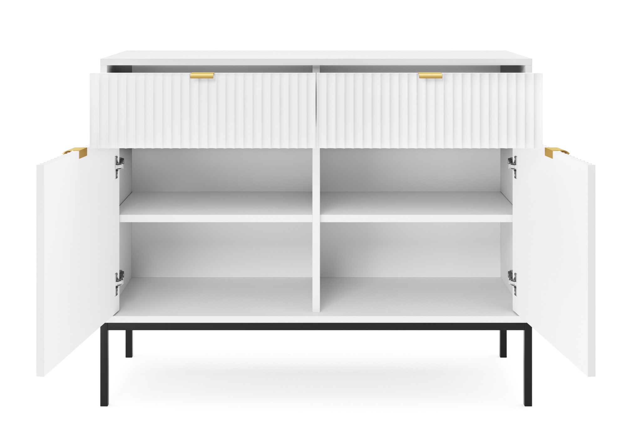 Představte si nejen moderní, ale také funkční kus nábytku, který se stane středobodem Vašeho obývacího pokoje - moderní komoda NEMO. Tento kousek nábytku je dokonalým spojením moderních prvků v dekoru Bílá s vysokými kovovými nohami v černé nebo zlaté barvě se zlatými úchytky.