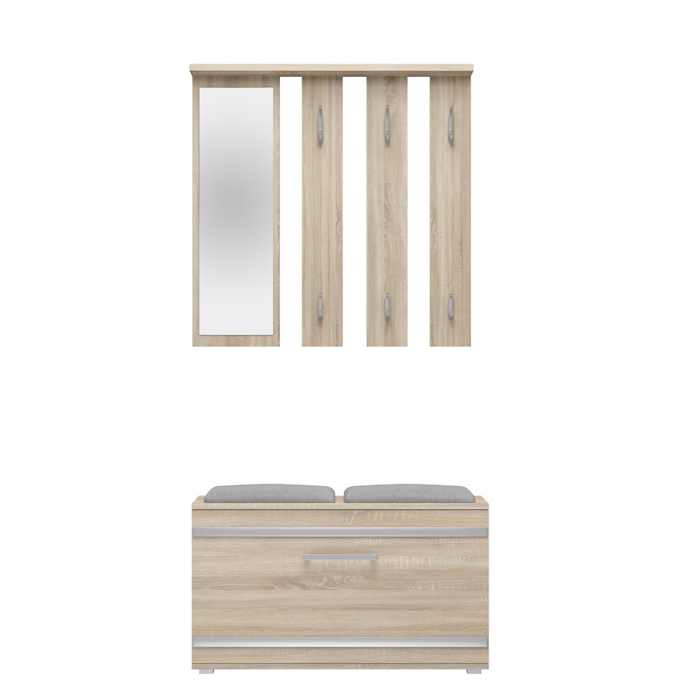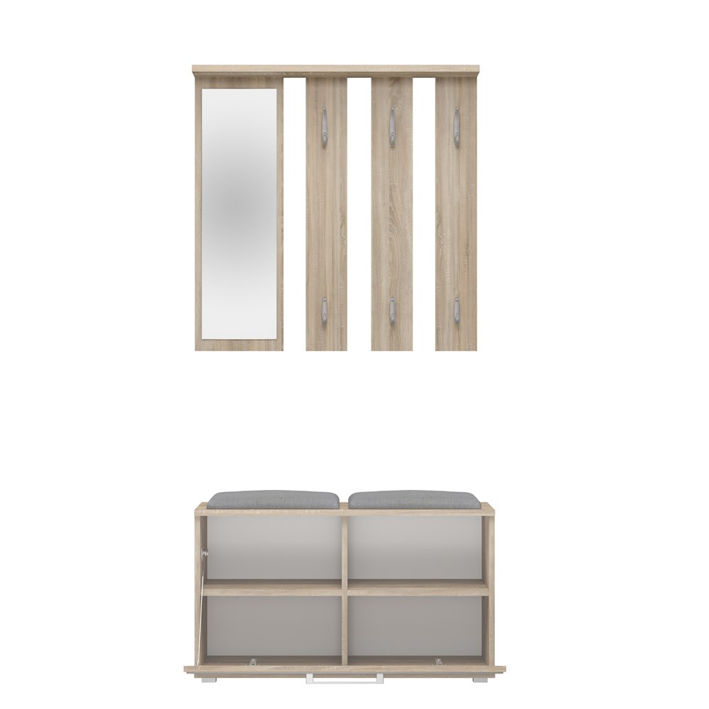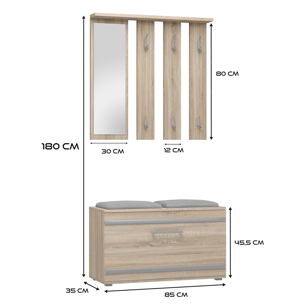 Tato předsíňová stěna je skvělým řešením pro ukládání vašich věcí v předsíni. Obsahuje praktické prvky, jako jsou botník, věšáky a zrcadlo, které vám usnadní organizaci a zároveň vám pomohou udržet vaši předsíň čistou a uklizenou.