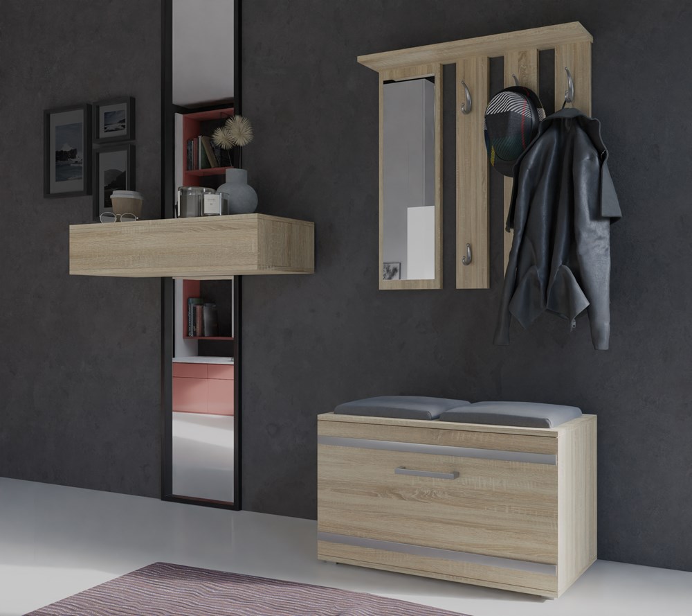 Botník na této stěně vám umožní uložit boty na jednom místě, což vám ušetří místo a pomůže udržet vaši předsíň uklizenou. Věšáky pak nabízejí dostatek prostoru pro uložení kabátů, bund a dalšího oblečení. Zrcadlo na stěně navíc nejenom poskytuje praktickou funkci, ale také vizuálně zvětšuje místnost a dodává vašemu interiéru moderní vzhled.