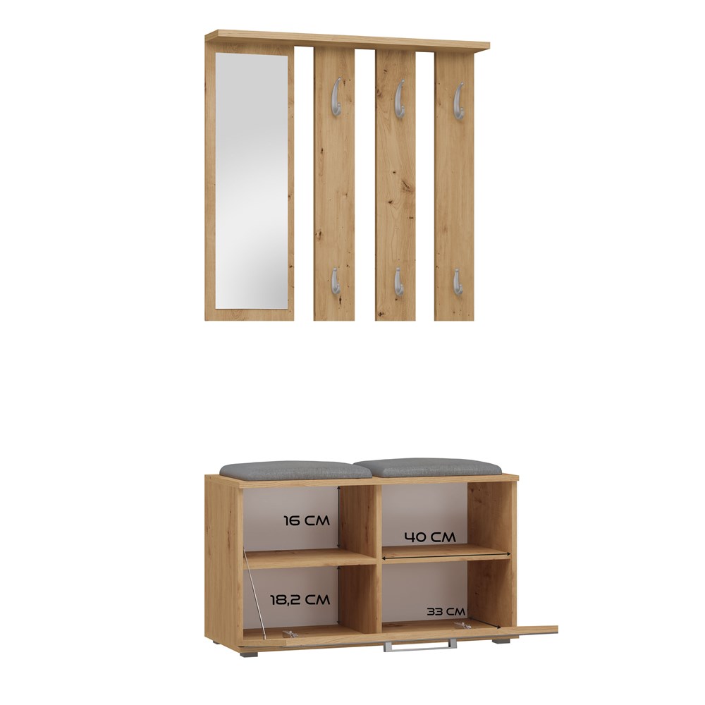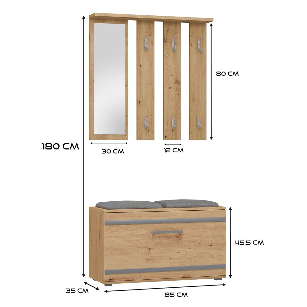 Tato předsíňová stěna je skvělým řešením pro ukládání vašich věcí v předsíni. Obsahuje praktické prvky, jako jsou botník, věšáky a zrcadlo, které vám usnadní organizaci a zároveň vám pomohou udržet vaši předsíň čistou a uklizenou.