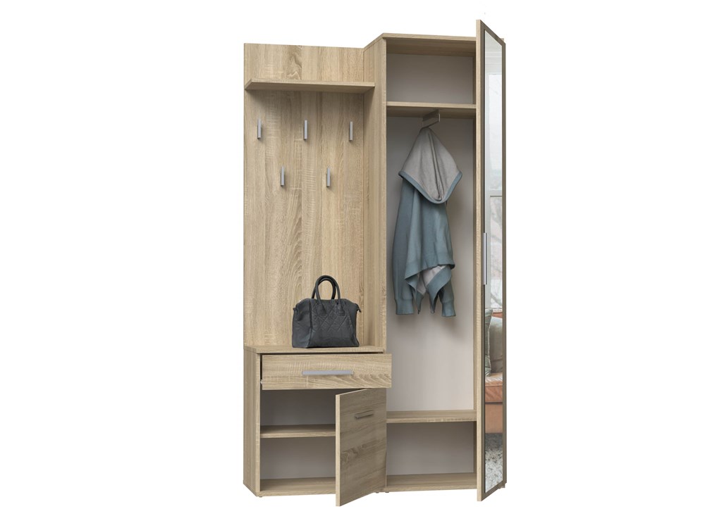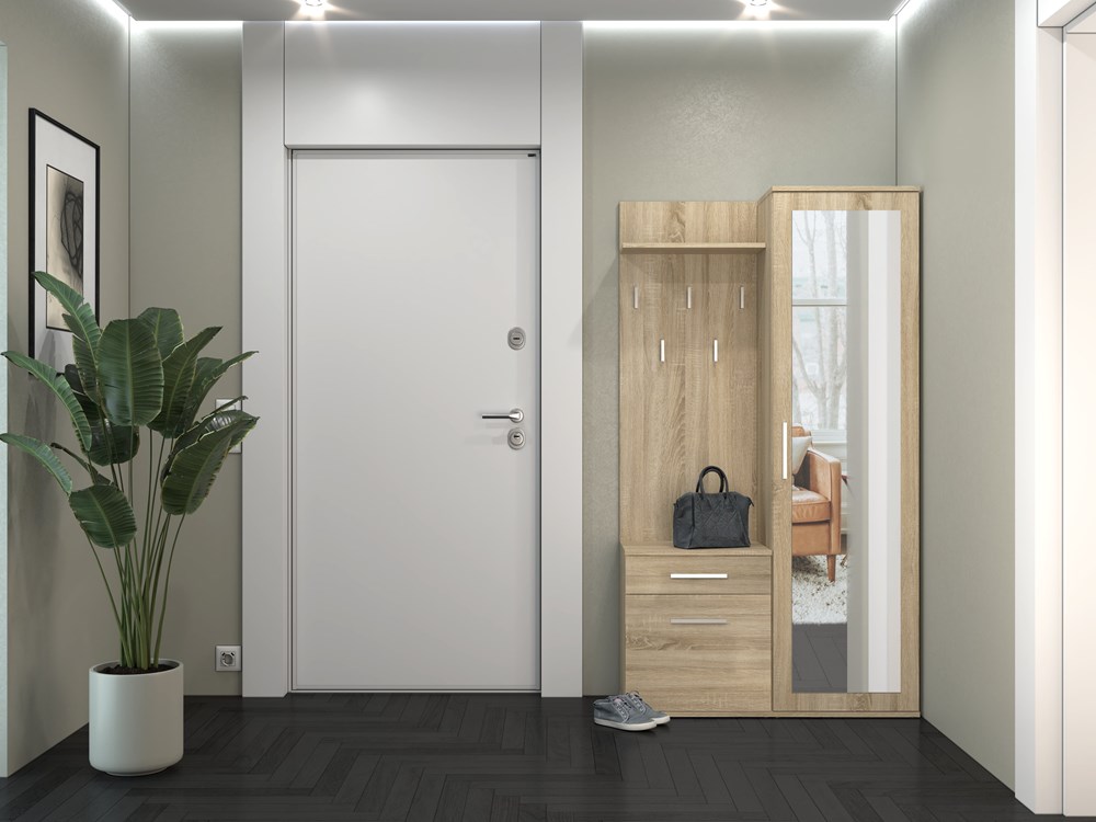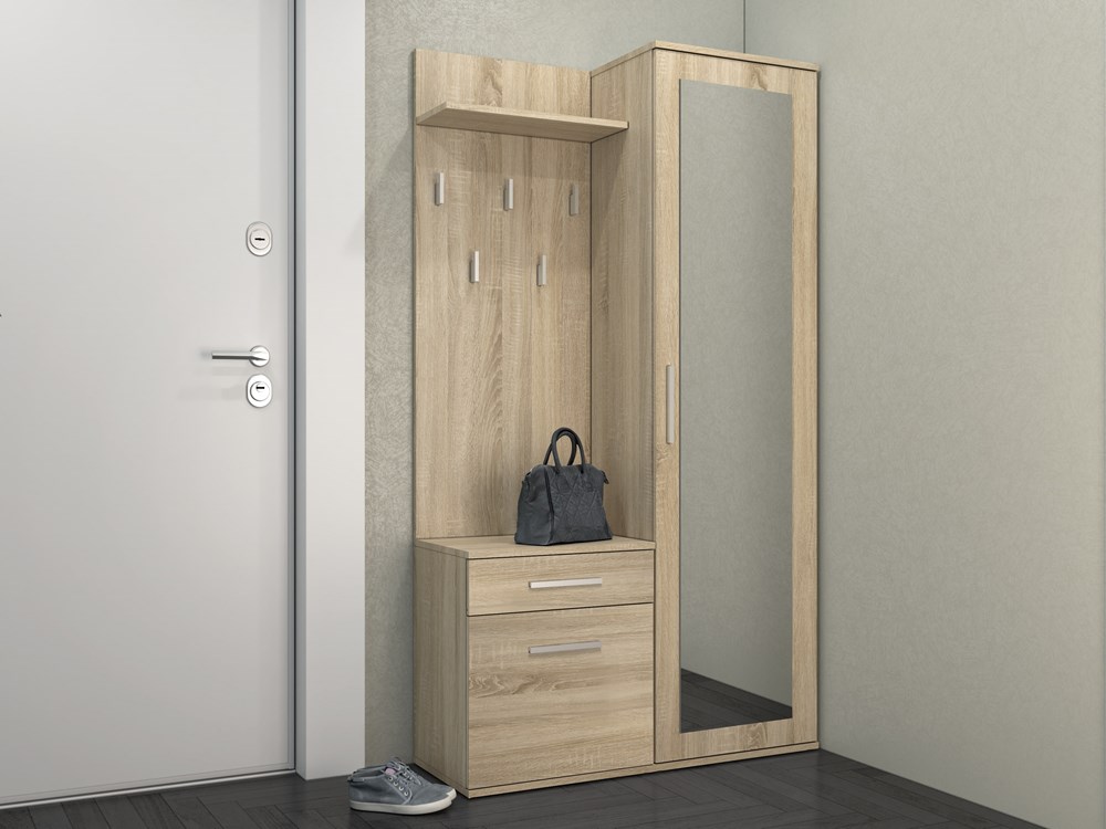 Skříň na této stěně vám umožní uložit věci, které nechcete nebo nemůžete vložit do botníku nebo na věšák. Díky zrcadlovým dveřím navíc získáte praktickou funkci zrcadla, které můžete použít při obouvání nebo při posledním rychlém "checku" před odchodem. Věšáky nabízejí dostatek prostoru pro uložení kabátů, bund a dalšího oblečení, a botník vám umožní uložit boty na jednom místě, což vám ušetří místo a pomůže udržet vaši předsíň uklizenou.