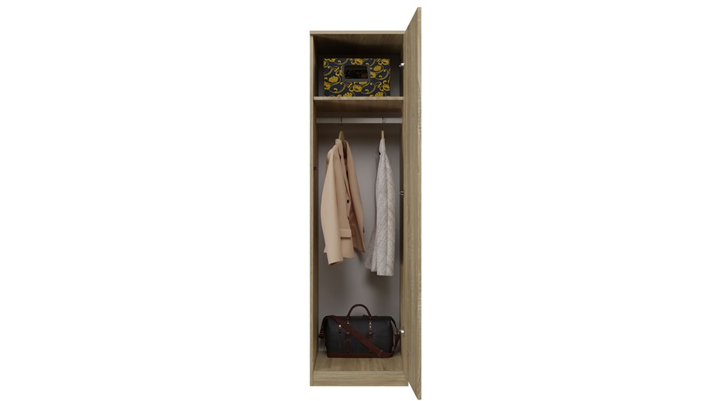 Když se rozhodnete pořídit šatní skříň SD-50, sada obsahuje tyč na zavěšení oblečení a police. V závislosti na účelu skříně v daném případě můžete při instalaci vybrat příslušnou možnost. Nábytek vyrobený z nejkvalitnější laminované desky odolné proti poškrábání a vlhkosti s ABS hranami. Boky skříně jsou zvenčí jednotné bez otvorů, což zvyšuje estetiku produktu.