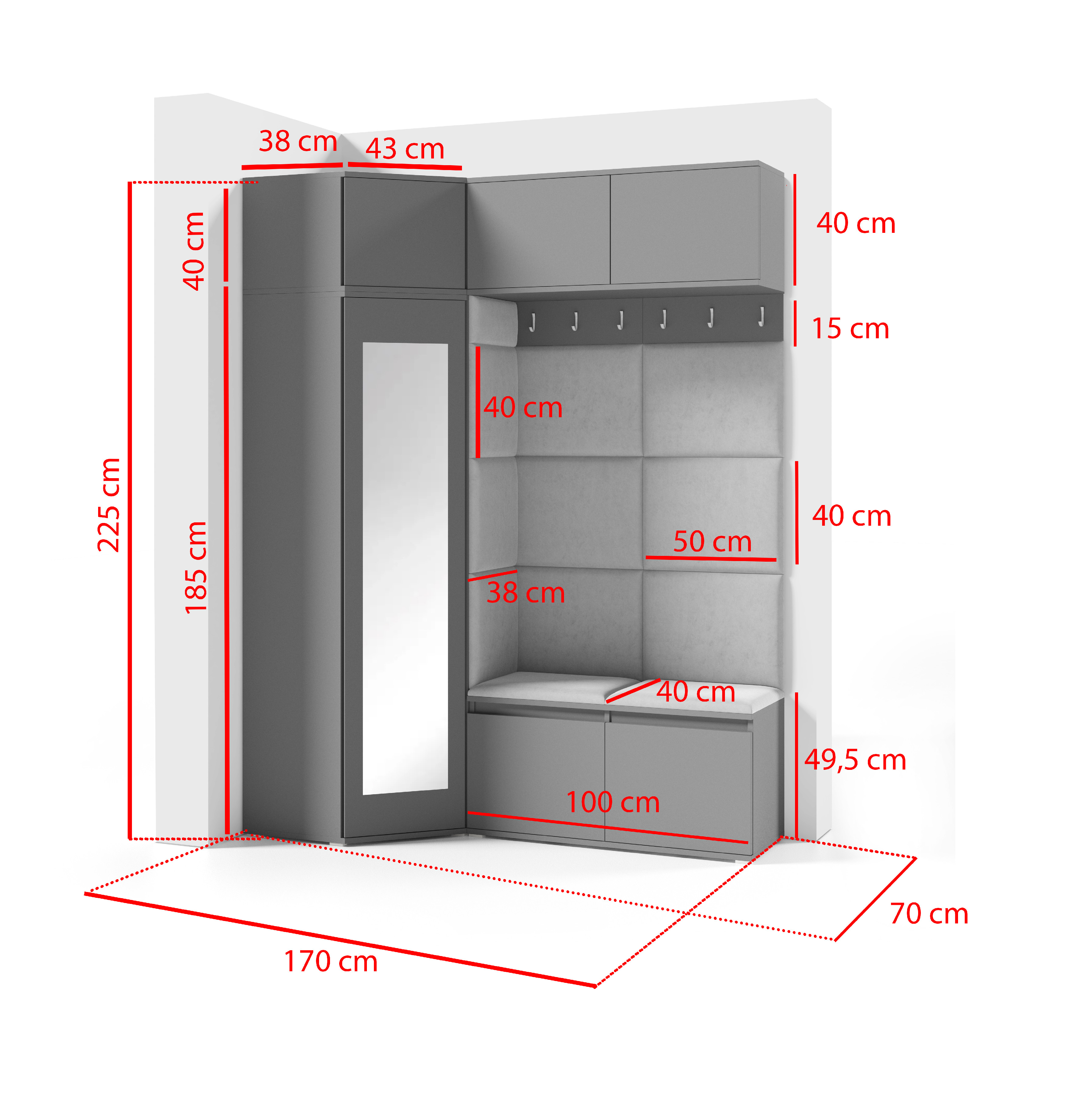 | Rozměr rohové šatní skříně | 43 x 185 x 70 cm |