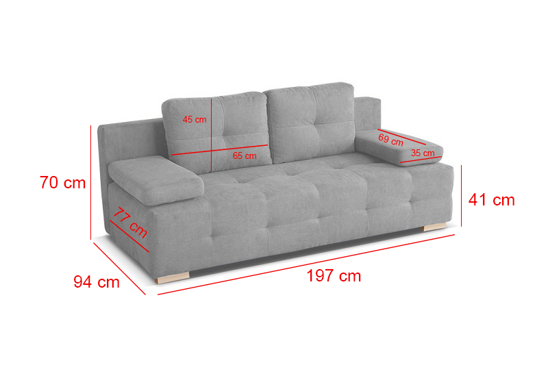 Korpus pohovky, soustružené dřevěné nožky, spojovací materiál a montážní návod.