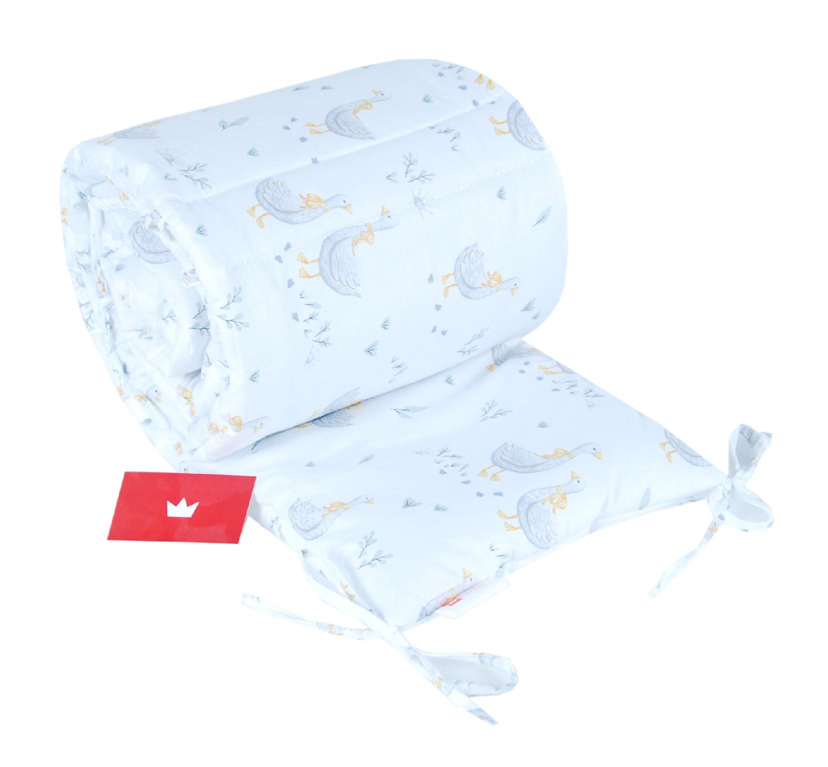 Mantinel je vyplněn načechraným rounem o hmotnosti 300 g / m2, má šňůrky pro připevnění k příčkám postýlky.