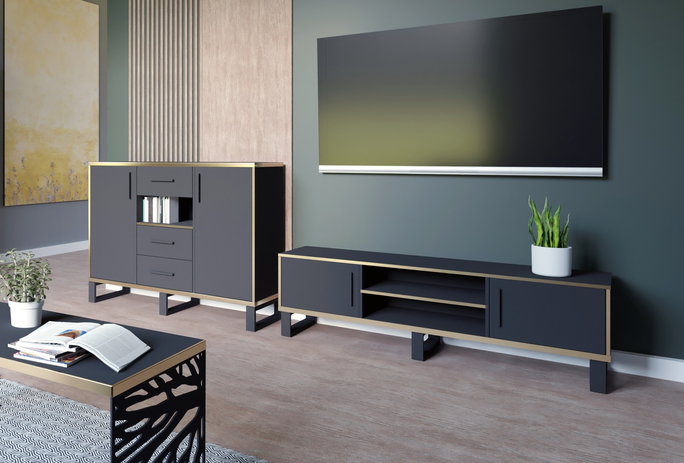 Představte si nejen moderní, ale také funkční kus nábytku, který se stane středobodem Vašeho obývacího pokoje - moderní komoda GOD. Tento kousek nábytku je dokonalým spojením moderních prvků v dekoru Černá se zlatými prvky s vysokými bytelnými kovovými nohami v černé barvě a s černými úchytky.