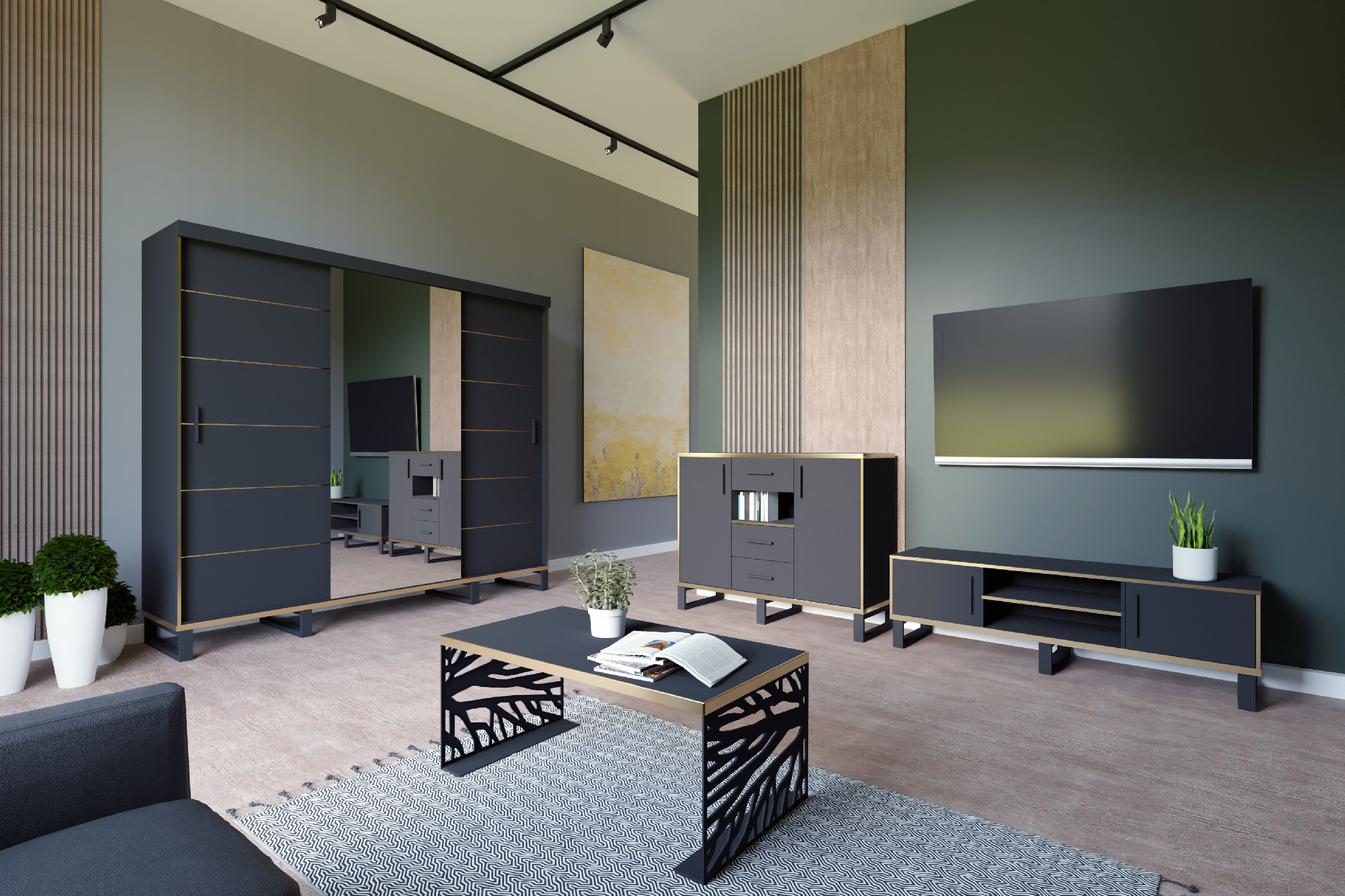 Celá kolekce se skládá z televizního stolku, komody, konferenčního stolku a tří šatních skříň (150, 200 a 250 cm).