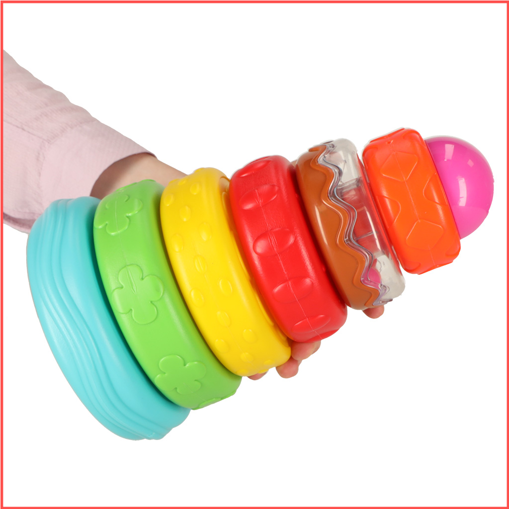 Sedm velkých bloků lze naskládat na sebe a vytvořit tak působivou pyramidu. Každý prvek má jinou barvu a jinou texturu. Jeden z bloků má navíc kuličky, které jsou vidět přes průhledný vršek.
