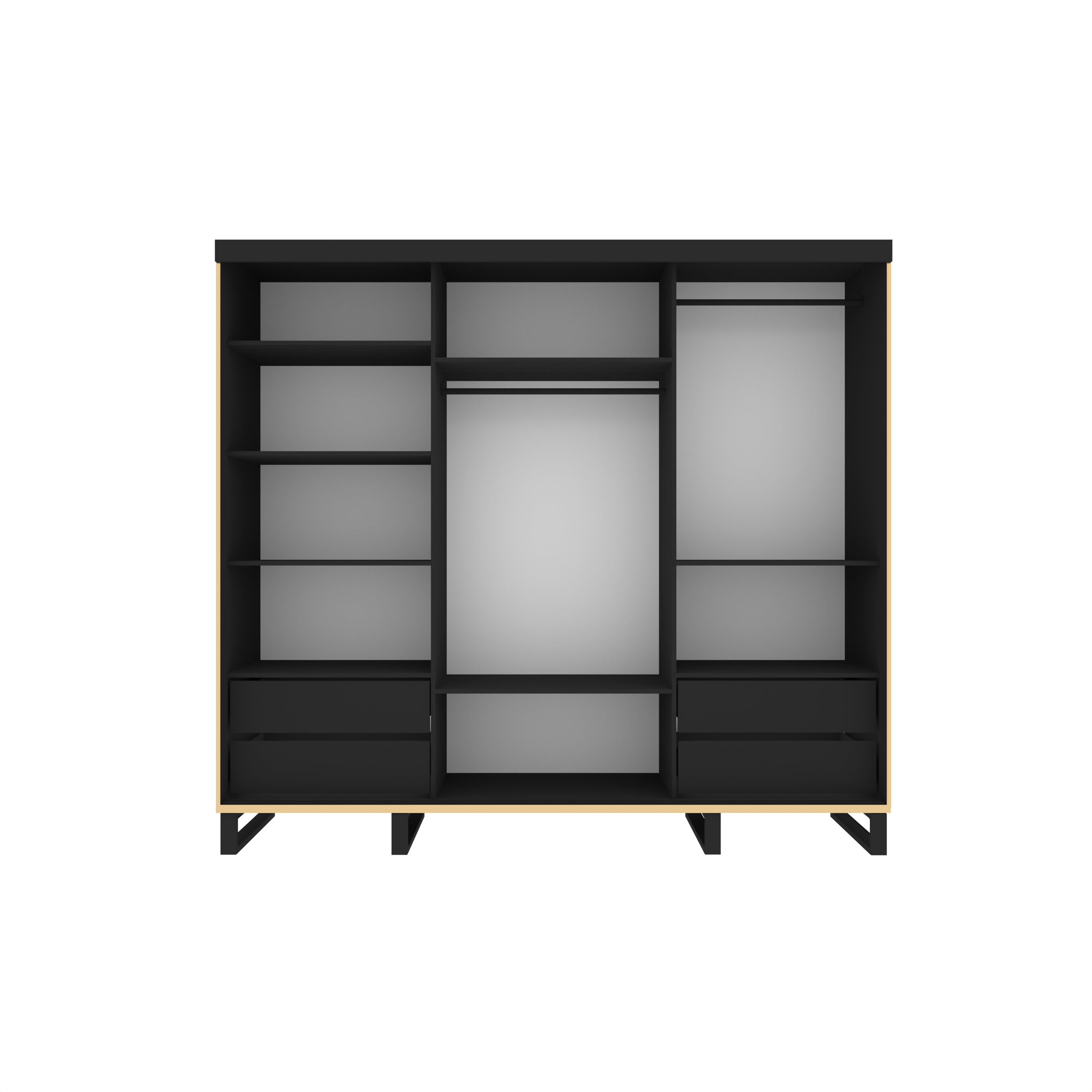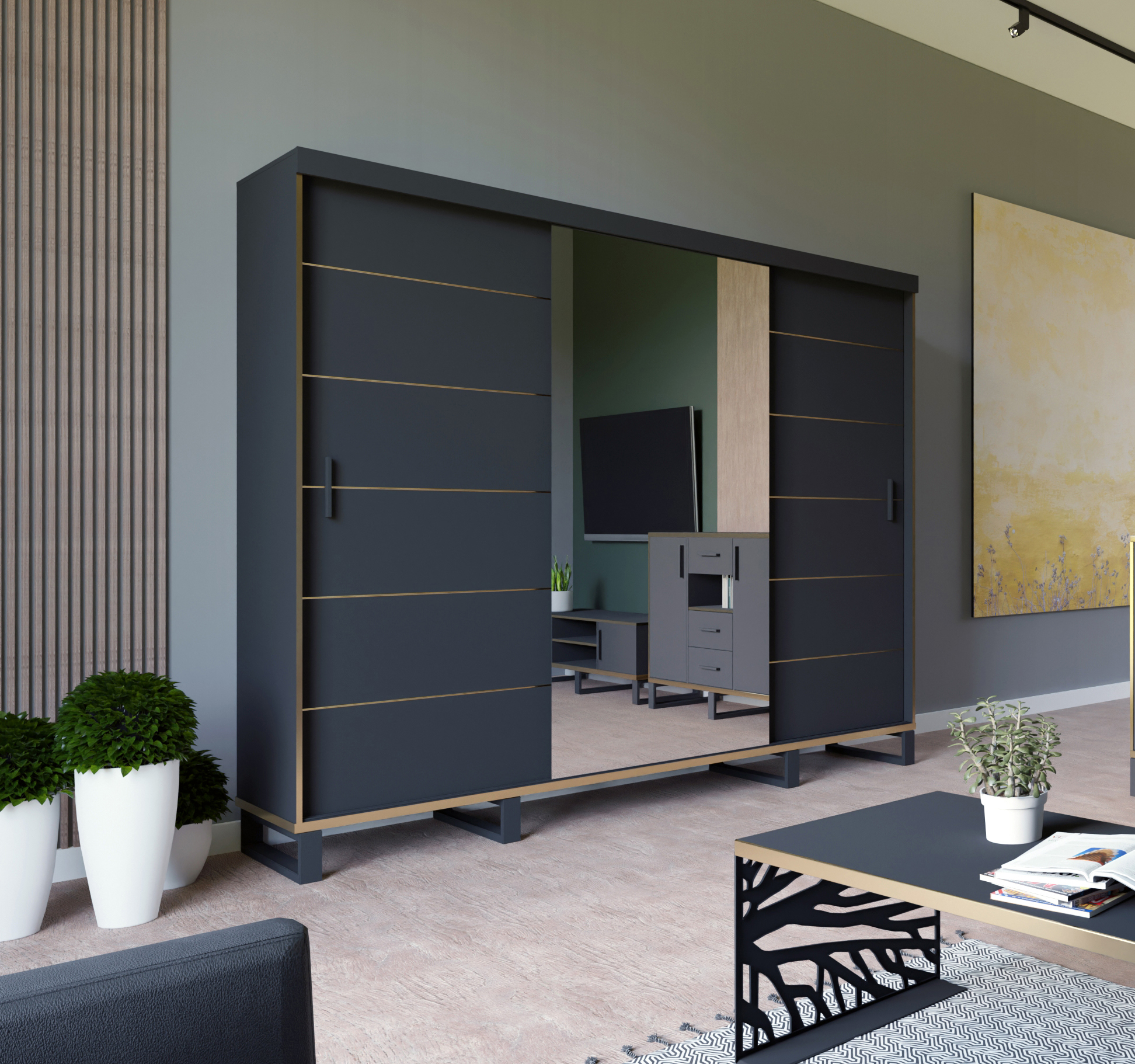 Představte si nejen moderní, ale také funkční kus nábytku, který se stane středobodem Vaší ložnice nebo předsíně - moderní šatní skříň GOD. Tento kousek nábytku je dokonalým spojením moderních prvků v dekoru Černá se zlatými prvky s vysokými bytelnými kovovými nohami v černé barvě.