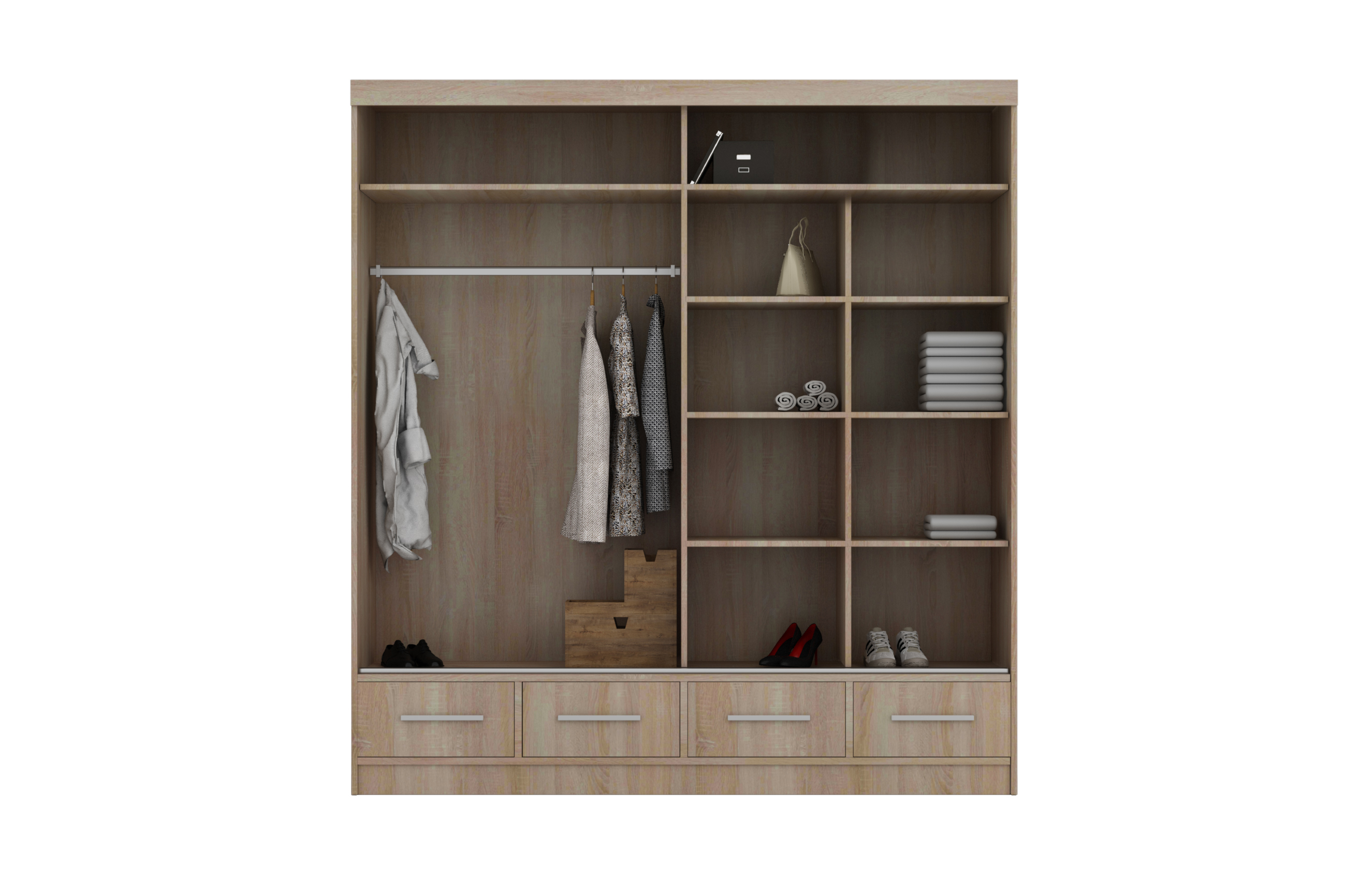 Vyrobená z kvalitního laminátu je tato skříň nejen odolná, ale i snadno udržovatelná. Její rozměry a chytré uspořádání poskytují dostatek úložného prostoru. Posuvné dveře jsou elegantně ukotveny v hliníkových lištách a umožňují plynulé a snadné otevírání. Tato vlastnost přispívá k celkové pohodlnosti a užitnosti skříně.