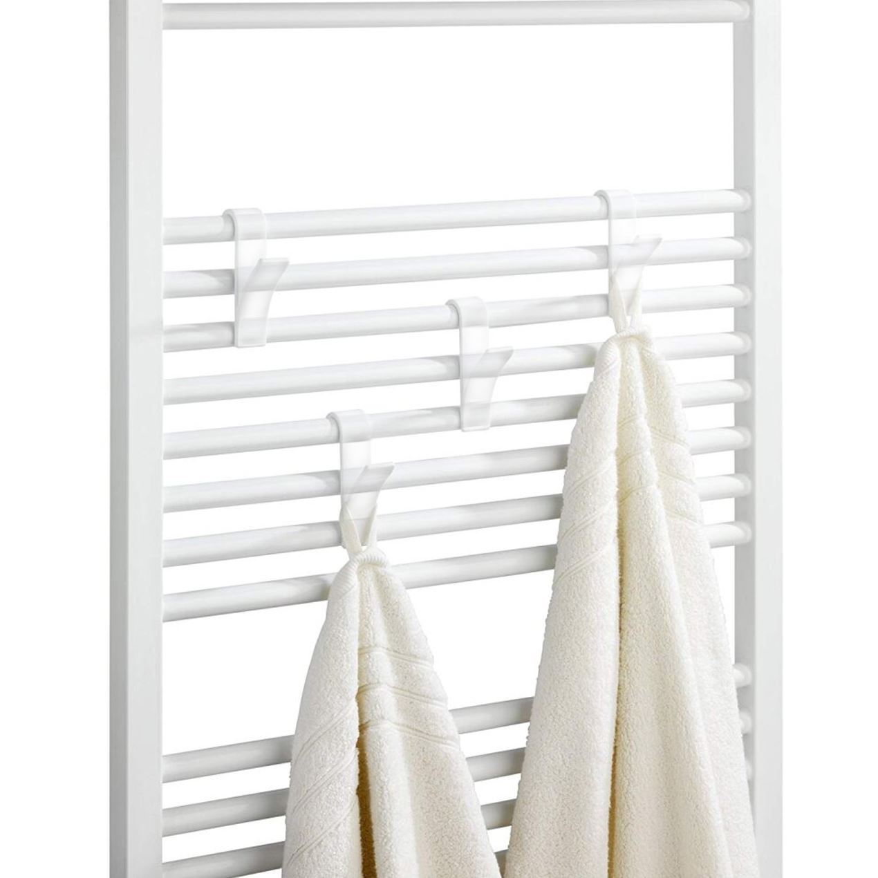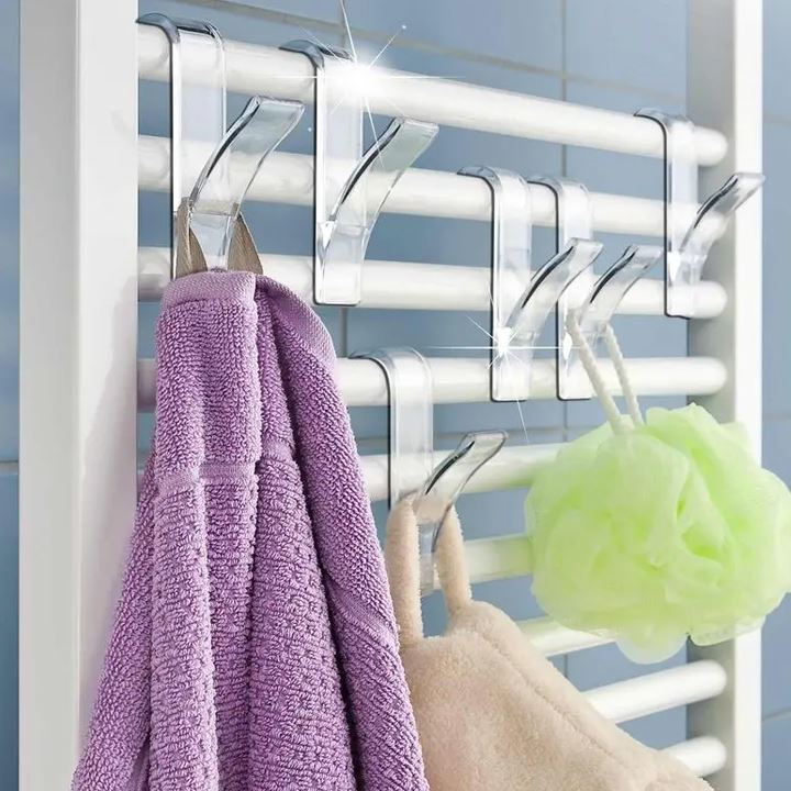 V balení obdržíte 2 ks transparentních háčků. Na ně zavěsíte nejen ručníky, ale i jiné koupelnové doplňky. Háček za radiátor zaháknete lehce a bez vrtání.