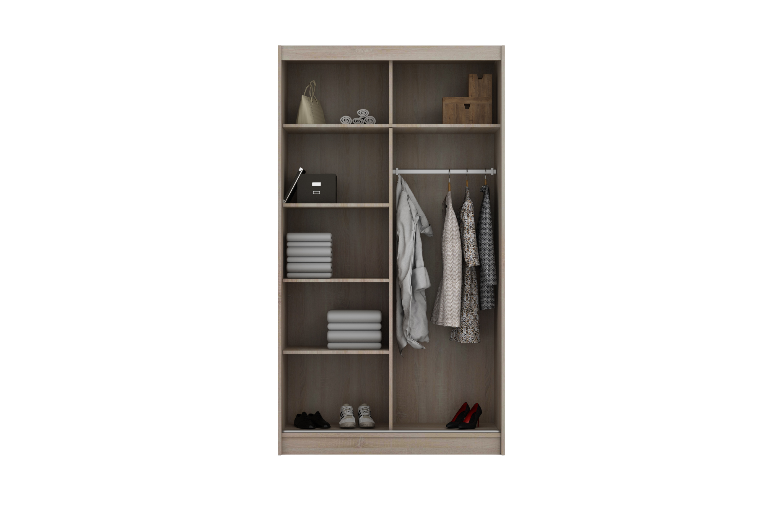 Šatní skříň disponuje posuvným systém otevírání dveří. Tento systém nejenže zajišťuje plynulé a tiché otevírání dveří, ale také výrazně šetří prostor ve srovnání s tradičními otevíracími mechanismy.
