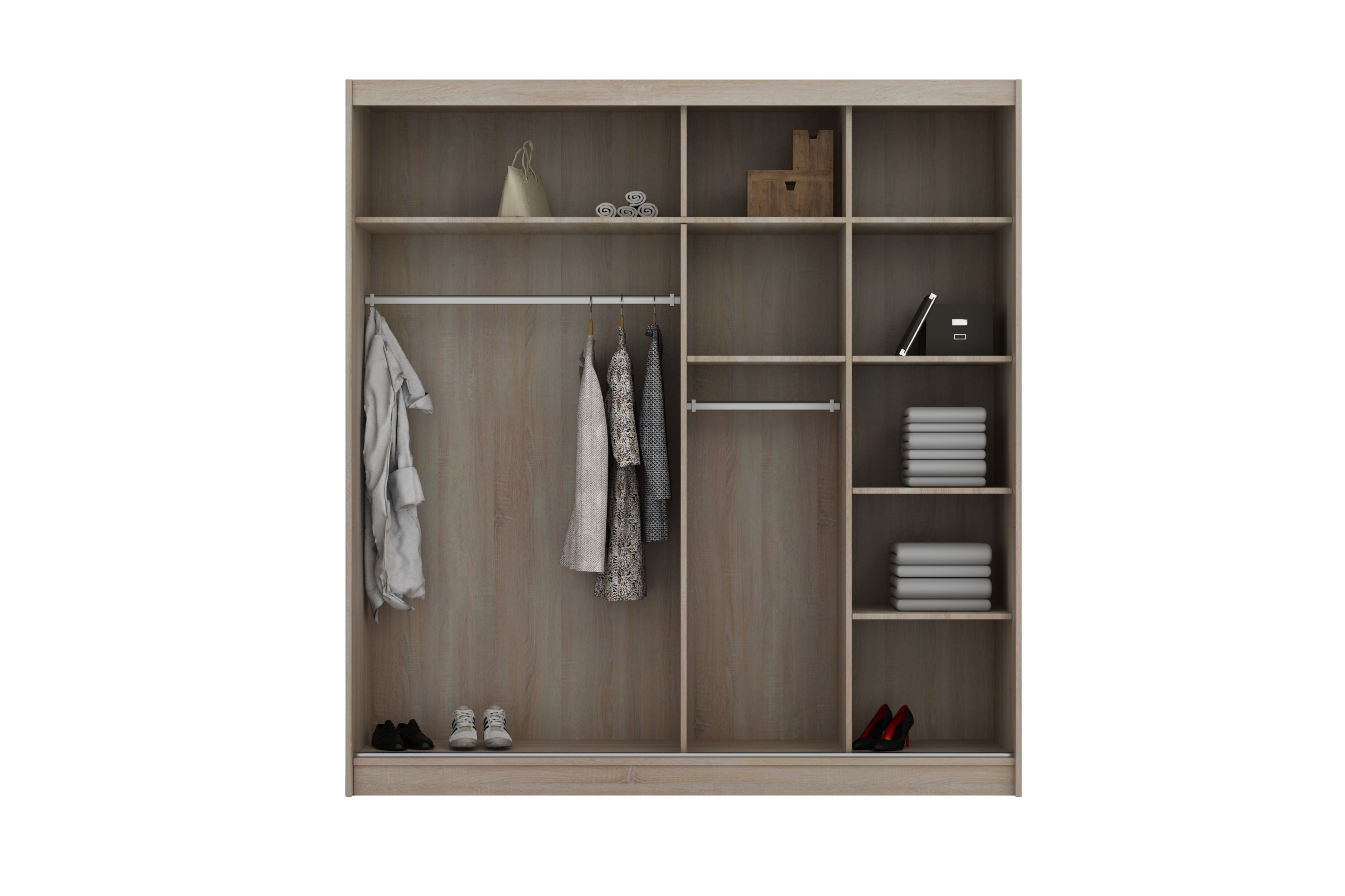 Šatní skříň disponuje posuvným systém otevírání dveří. Tento systém nejenže zajišťuje plynulé a tiché otevírání dveří, ale také výrazně šetří prostor ve srovnání s tradičními otevíracími mechanismy.