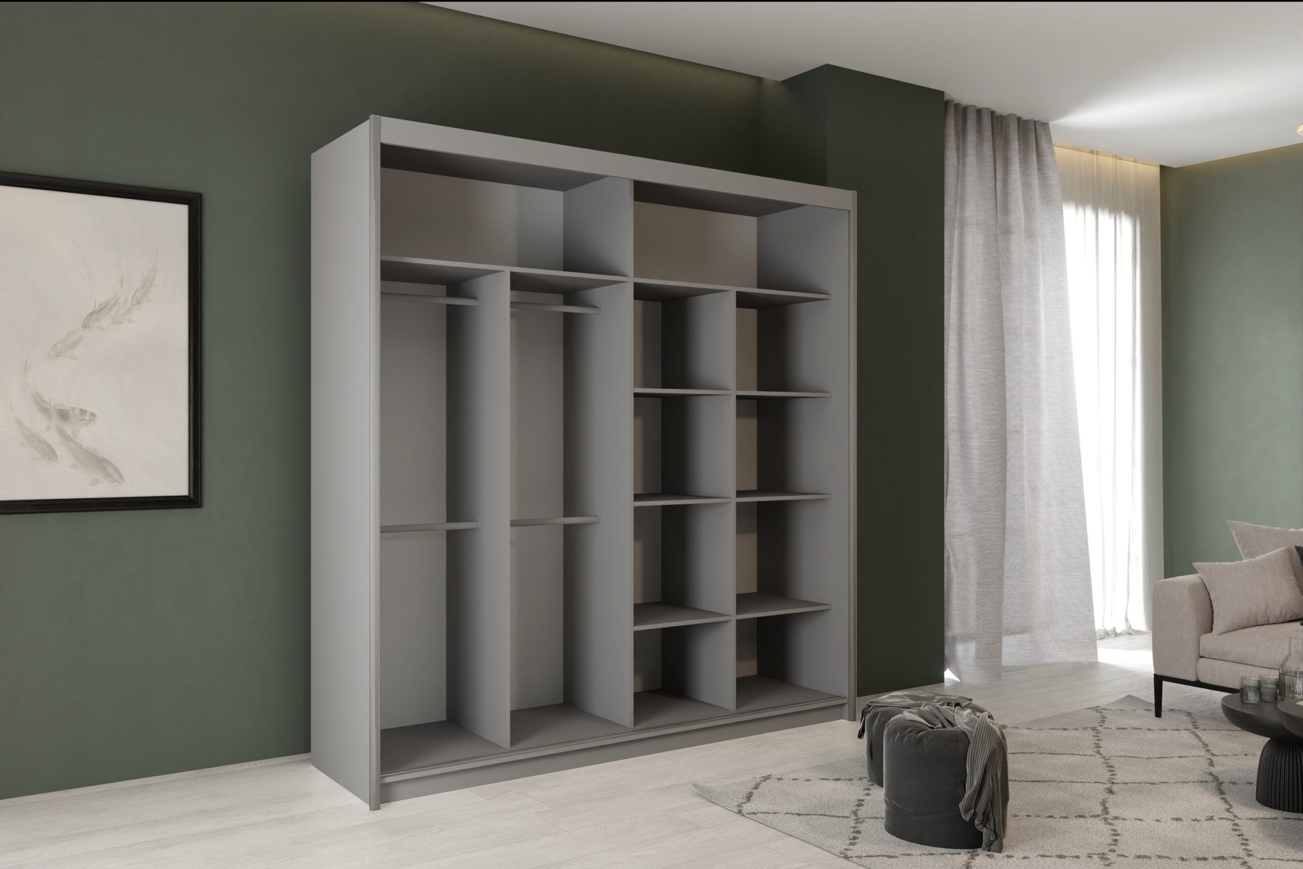 Moderní šatní skříň GREEN s posuvným systémem otevírání dveří, která spojuje moderní design s praktickými vlastnostmi.
