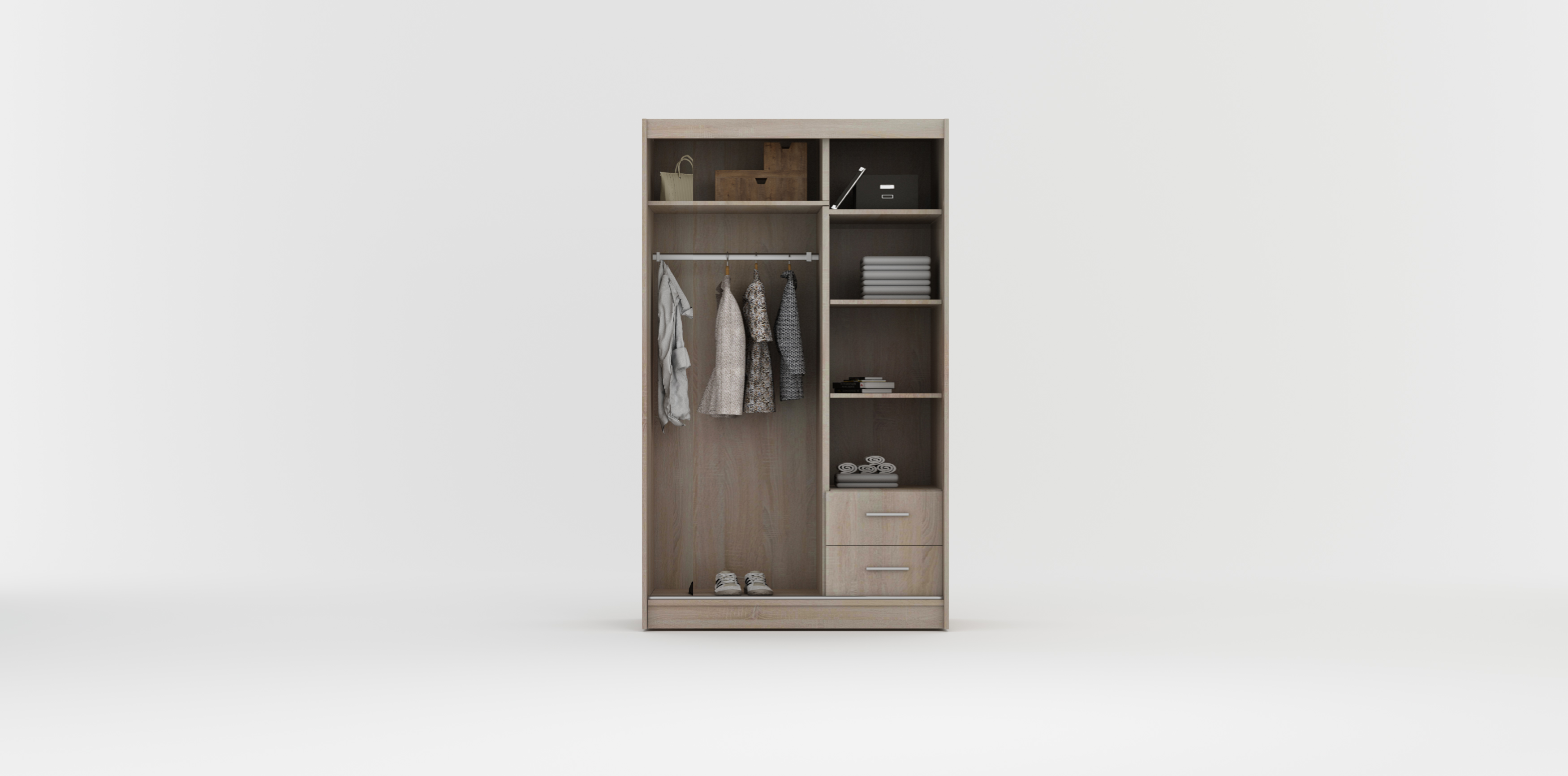 Hledáte-li spojení mezi elegantním designem a praktičností, tato šatní skříň je tím pravým řešením. Díky svému zajímavému designu se stane vynikajícím doplňkem každého interiéru. Tato skříň je rozdělena do dvou sekcí, které nabízejí dostatek prostoru pro pro Vaše oblečení a další osobní věci, zatímco vestavěné zrcadlo Vám umožní rychle zkontrolovat svůj vzhled před tím, než vyrazíte ven.