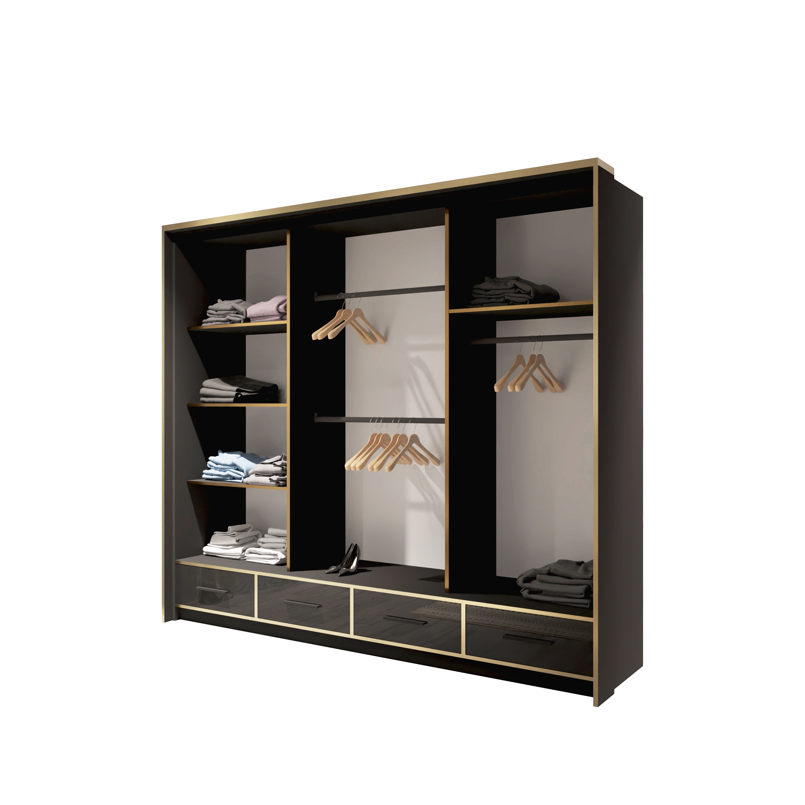 Šatní skříň disponuje posuvným systém otevírání dveří. Tento systém nejenže zajišťuje plynulé a tiché otevírání dveří, ale také výrazně šetří prostor ve srovnání s tradičními otevíracími mechanismy.