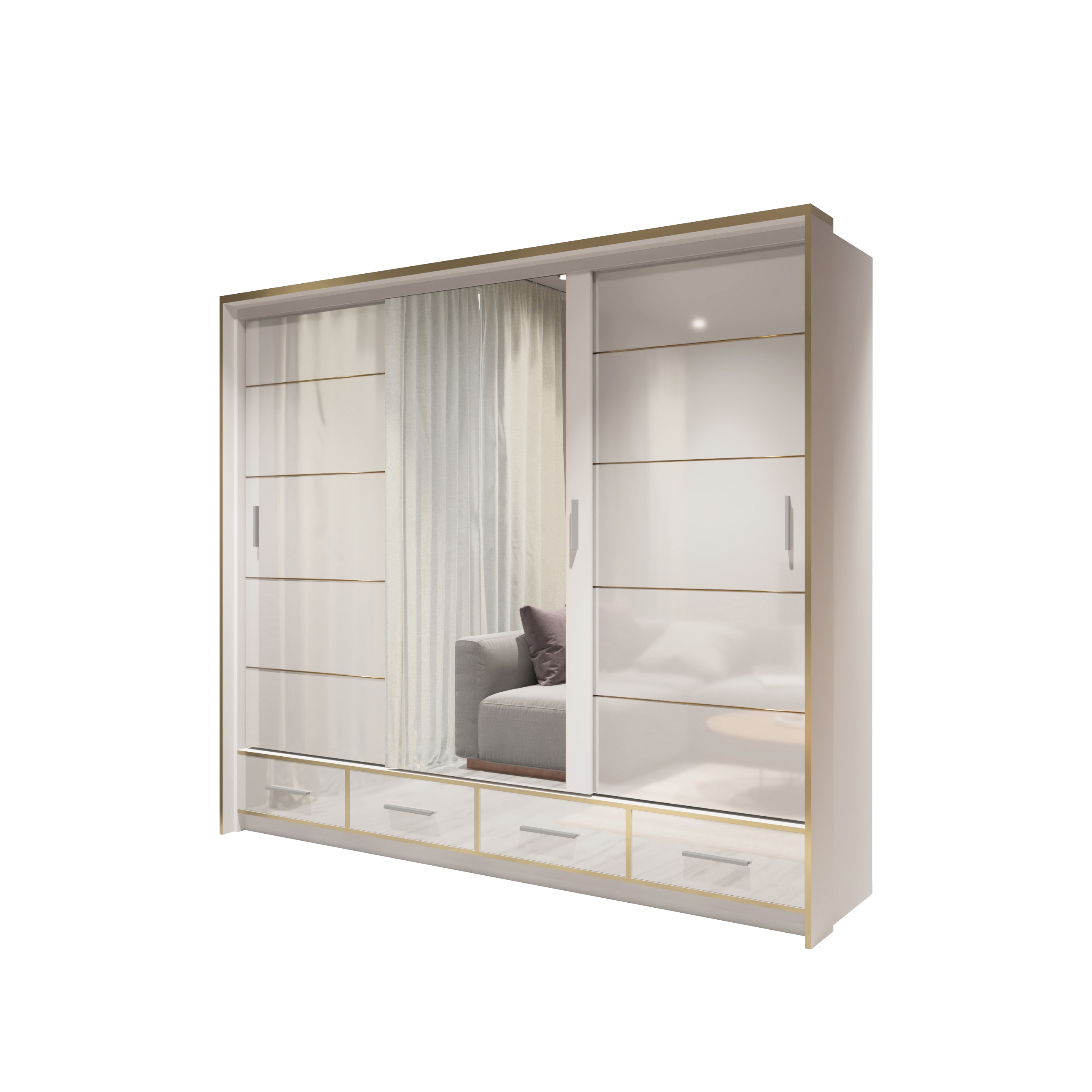 Moderní šatní skříň SABRINA s posuvným systémem otevírání dveří a LED osvětlením, která spojuje moderní design s praktickými vlastnostmi.