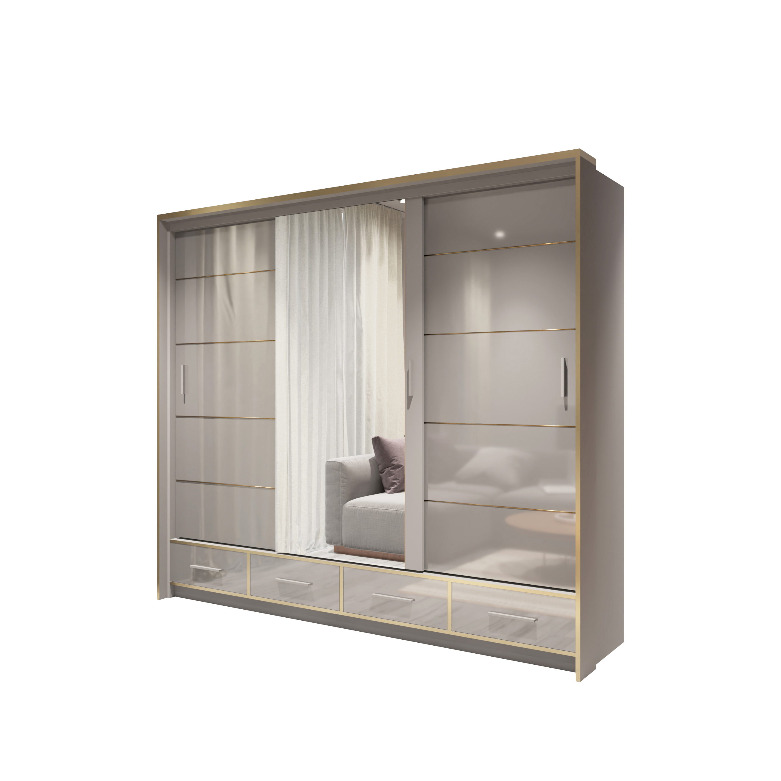 Moderní šatní skříň SABRINA s posuvným systémem otevírání dveří a LED osvětlením, která spojuje moderní design s praktickými vlastnostmi.