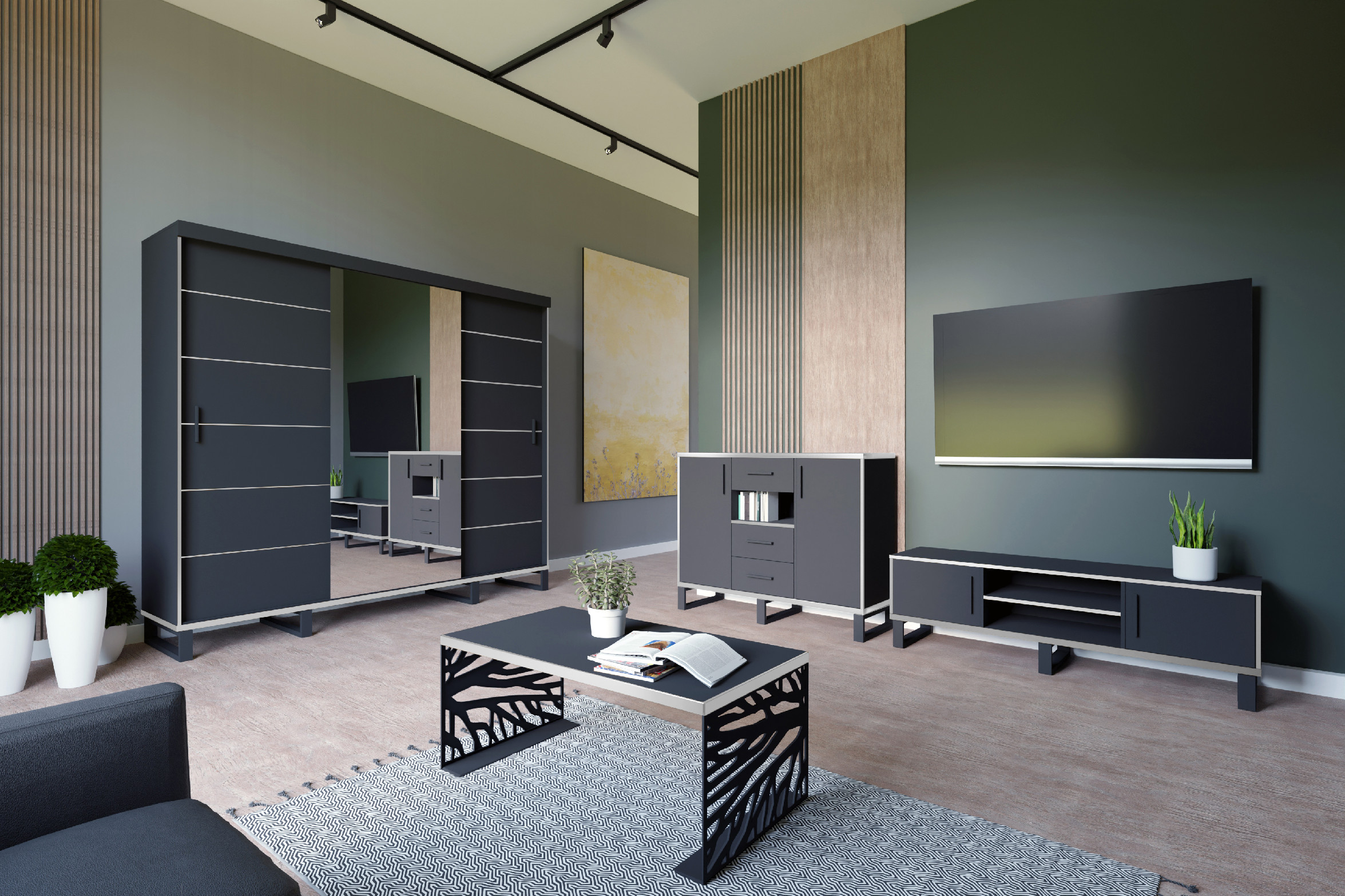 Celá kolekce se skládá z televizního stolku, komody, konferenčního stolku a tří šatních skříň (150, 200 a 250 cm).