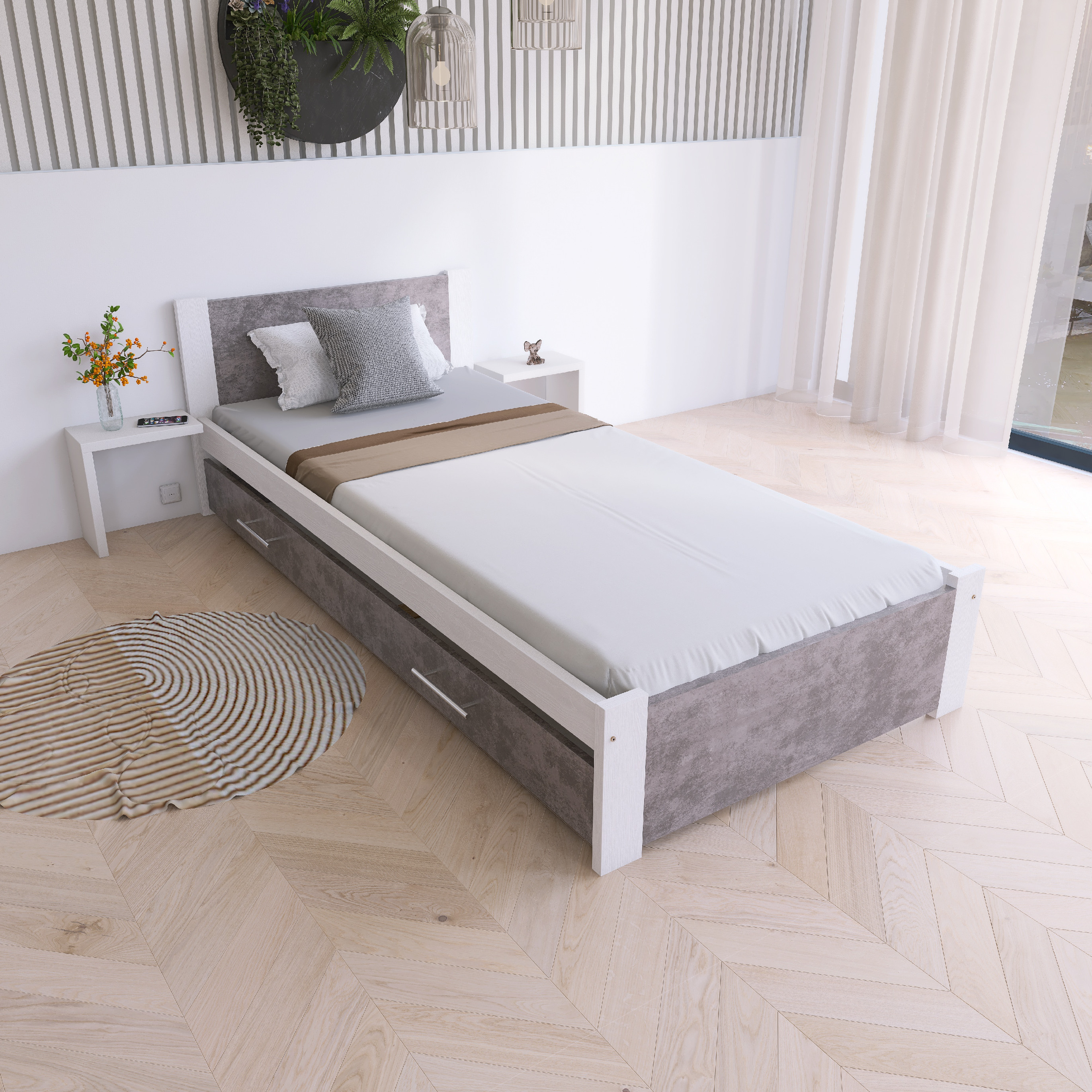 Čistý design se hodí k většině postelí a interiérů. Skvěle doplňuje nábytek z masivu.