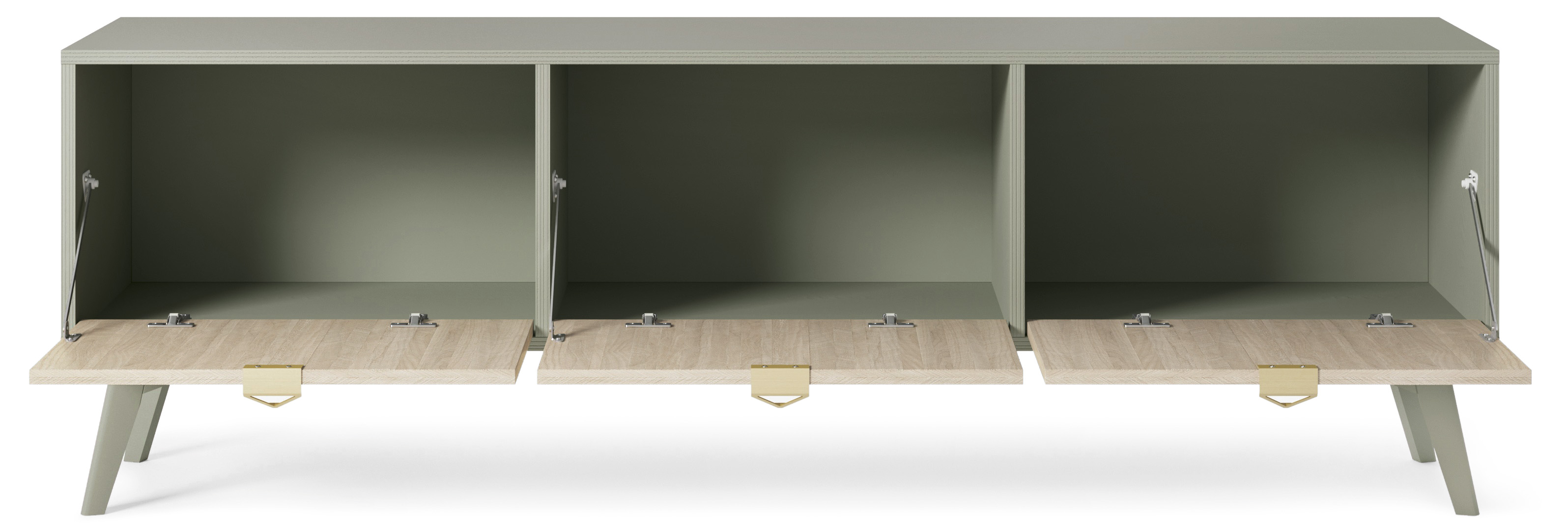 Představte si nejen moderní, ale také funkční kus nábytku, který se stane středobodem Vašeho obývacího pokoje - moderní televizní stolek NATURAL. Tento kousek nábytku je dokonalým spojením jedinečných moderních a přírodních prvků v dekoru Eukalyptus/Scandi s vysokými dřevěnými nohami a zlatými úchytky pro snadné otevírání a zavírání dvířek.