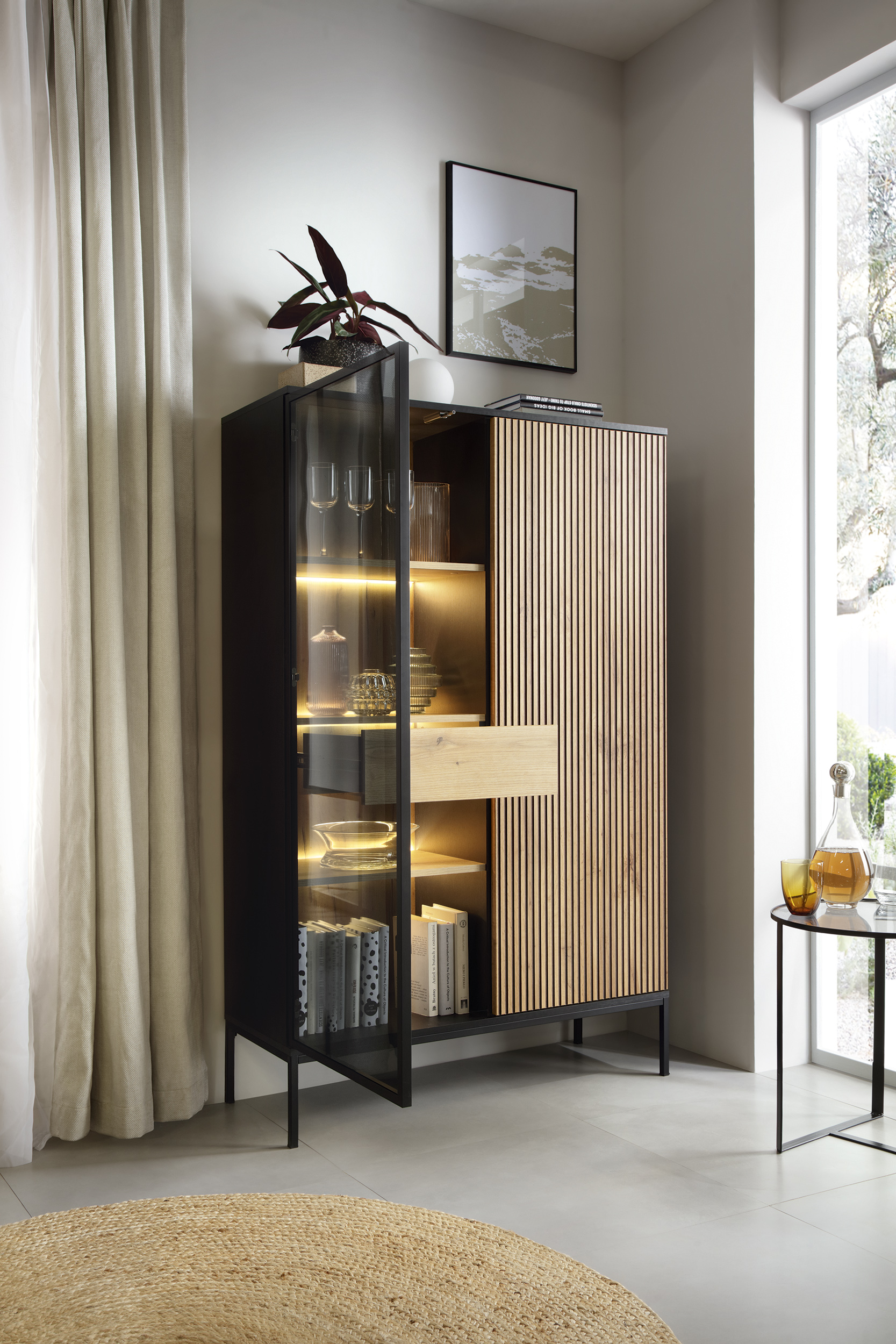 Představte si nejen moderní, ale také funkční kus nábytku, který se stane středobodem Vašeho obývacího pokoje - moderní vitrínová skříň SANTAL. Tento kousek nábytku je dokonalým spojením jedinečných moderních a přírodních prvků v dekoru Černá/Dub Votan s vysokými kovovými nohami a vybaven systémem push to open pro snadné otevírání a zavírání dvířek.