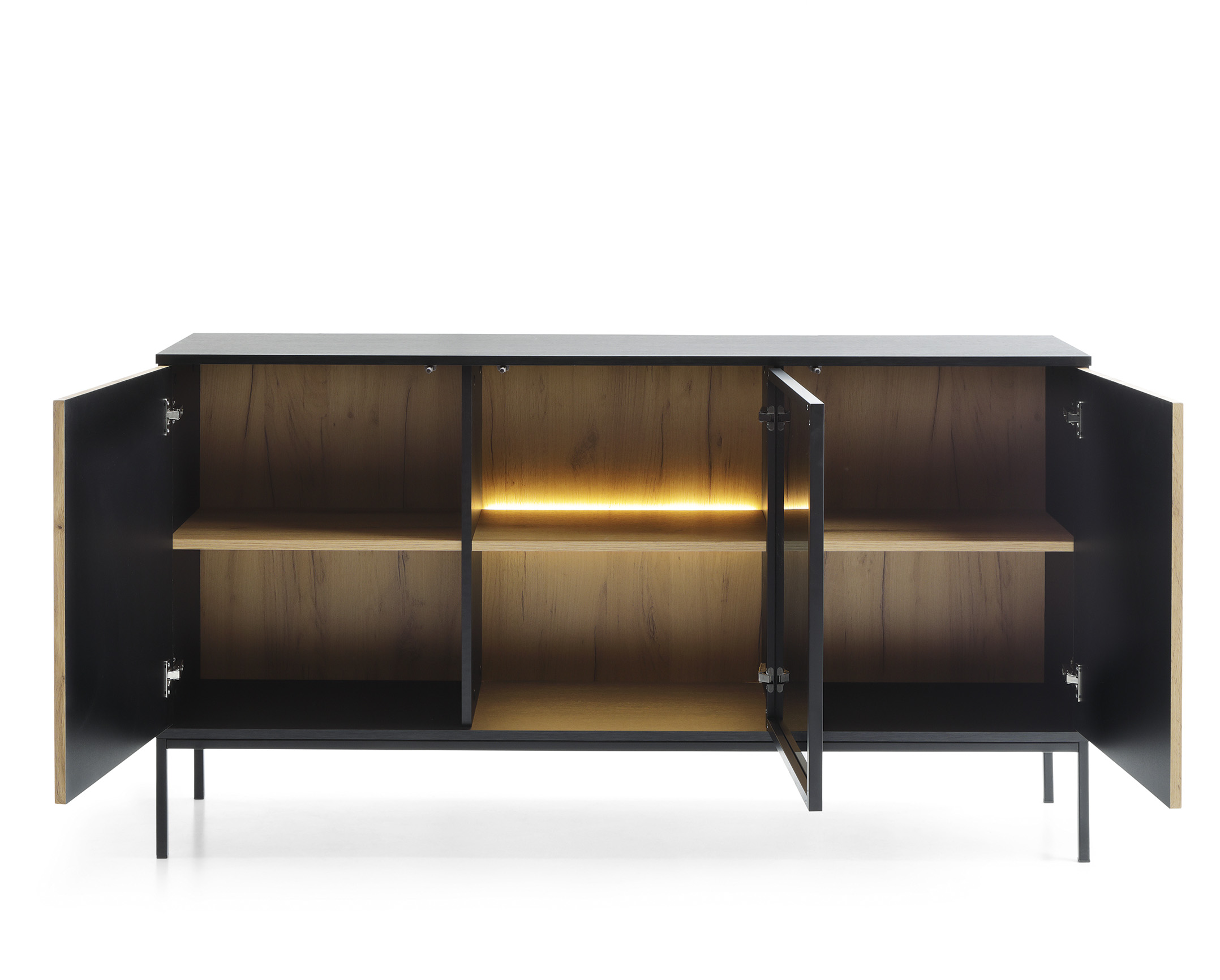 Komoda je široká 154 cm, nabízí dostatek úložného prostoru v podobě tři uzavřených polic za dvířky. Nábytek je osvětlen pomocí LED osvětlení.