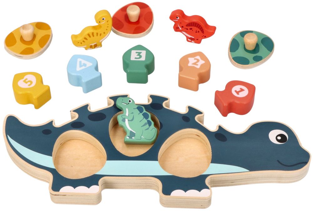Záda dinosaura jsou opatřena drážkami, do kterých batole vkládá příslušné bloky od 1-5. Batole vkládá puzzle do příslušných otvorů a zároveň si procvičuje rozpoznávání tvarů a barev.
