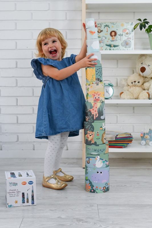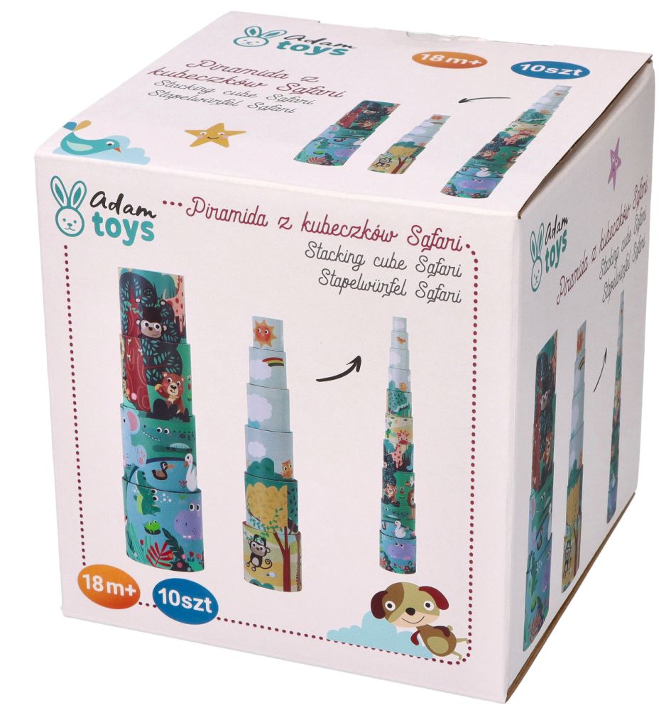 Safari pyramida je sada 10 barevných kelímků různých velikostí, které lze použít ke stavbě věže nebo k uspořádání mnoha různými způsoby. Díky unikátním ilustracím se malí seznámí se zvířátky z džungle a naučí se počítat od 1 do 10. Pyramida je vynikající hračka, která vám umožní procvičit motorickou koordinaci a obratnost.