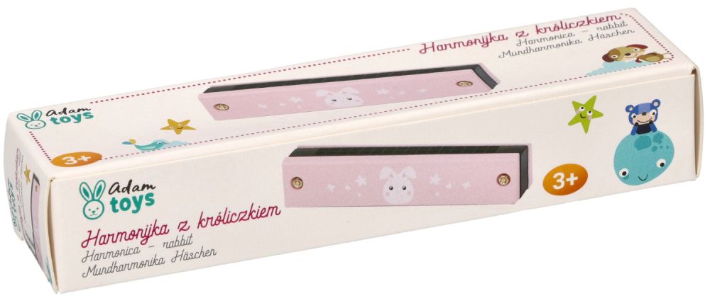 Krásná harmonika bude skvělým prvním nástrojem pro každého mladého milovníka hudby. Co na této hračce upoutá ze všeho nejvíce, je její vizuální stránka. Krásné barvy zdobené sladkým zajíčkem. Zajíček nám zdobí harmoniku, protože také rád poslouchá hudbu a ze zvuků, které hrajete, mu poskakují tlapky.