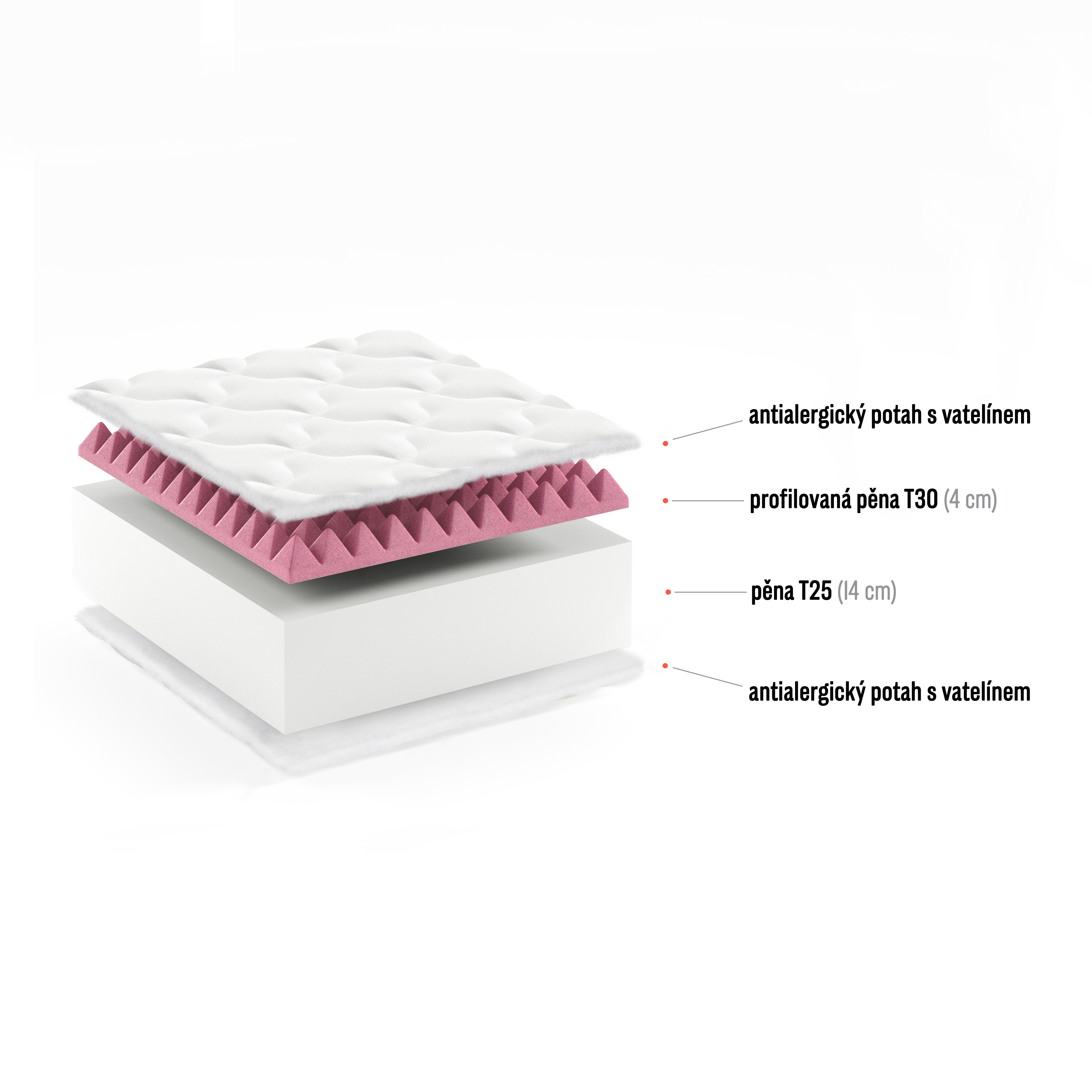 Matrace z PUR pěny T25 je typ matrace vyrobené z polyuretanové pěny (PUR), konkrétně z T25 pěny, což označuje tuhost a kvalitu pěny použité při výrobě matrace. Matrace z T25 pěny má obvykle střední tuhost, což ji činí vhodnou pro širokou škálu spáčů. Je dostatečně pevná, aby poskytla podporu tělu, ale zároveň má i určitou měkkost, což přispívá k pohodlí při spánku. PUR pěna se dokáže dobře přizpůsobit tvaru těla, což zajišťuje pohodlný spánek. Pěna reaguje na tělesnou teplotu a váhu, což umožňuje matraci lépe podporovat různé části těla.