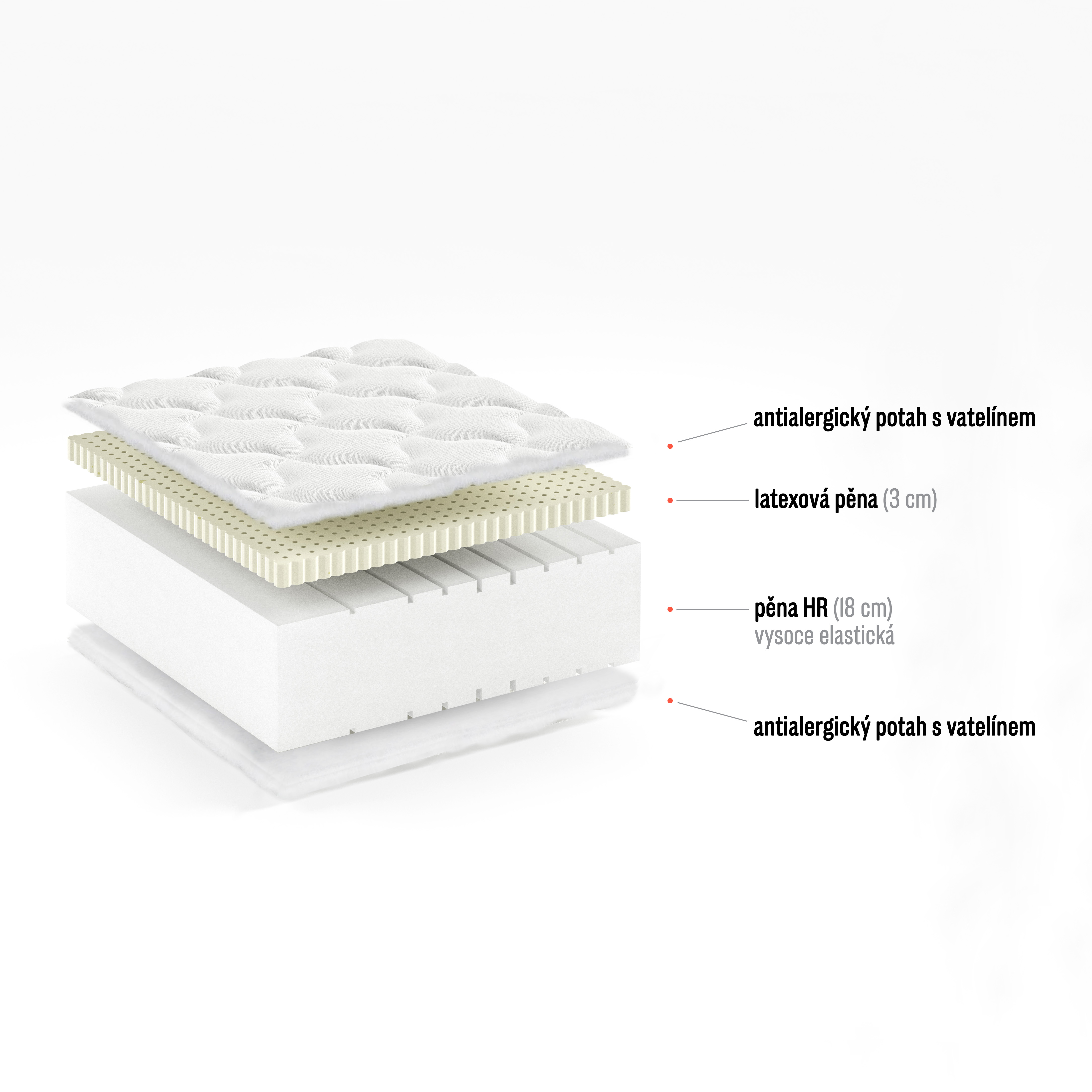 Užijte si kvalitní a zdravý spánek s pěnovou matrací s vysoce elastickou HR pěnou a latexem COMPO výšce 22 cm, která dokonale reaguje na tvar Vašeho těla. Tato matrace je vyrobena z vysoce elastické HR pěny, která je pokrytá latexem (3 cm) na jedné straně. Matrace je měkké tuhosti H2(na stupnici tvrdostí H1-H5) a je vhodná pro osoby s hmotností do 150 kg.Hypoalergenní potah s všitým zipem lze snadno sundat a vyprat při teplotě 40 °C.