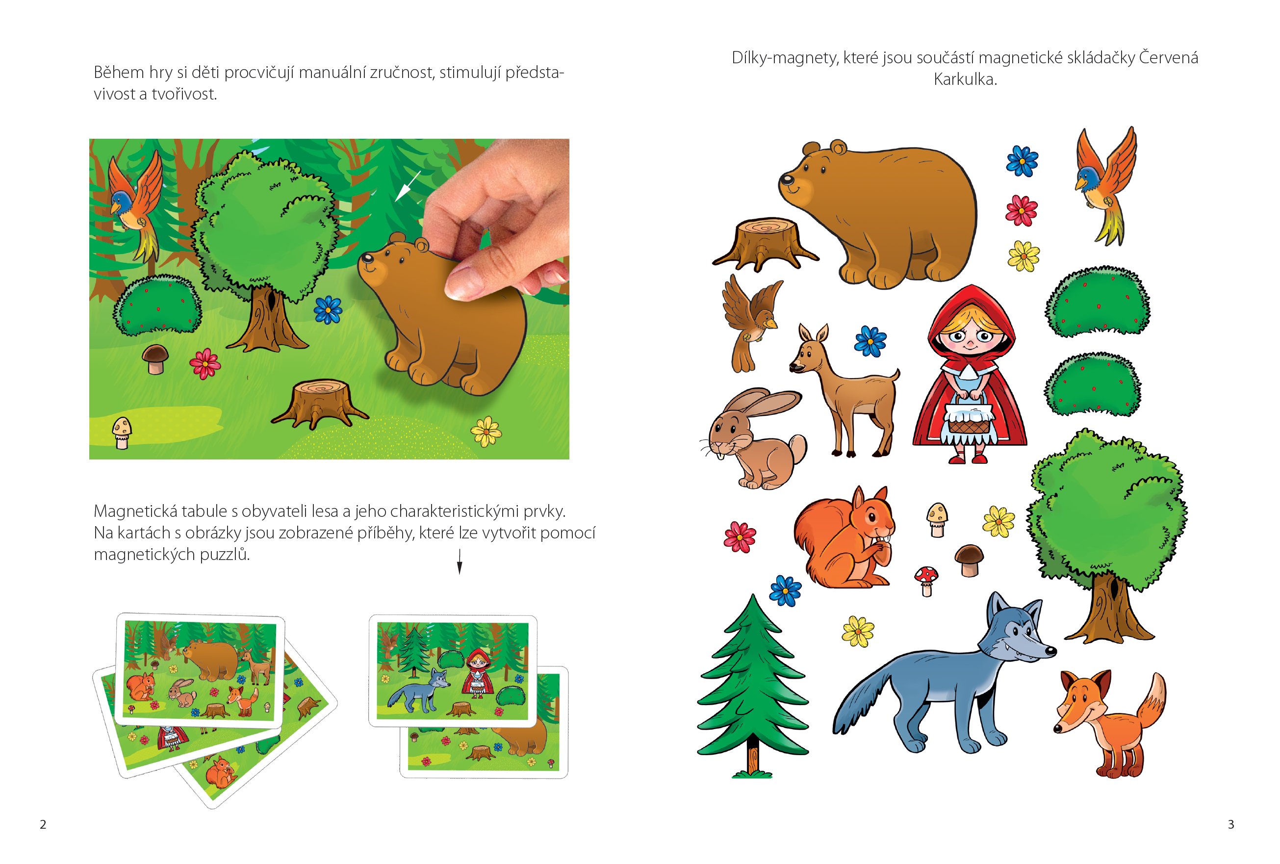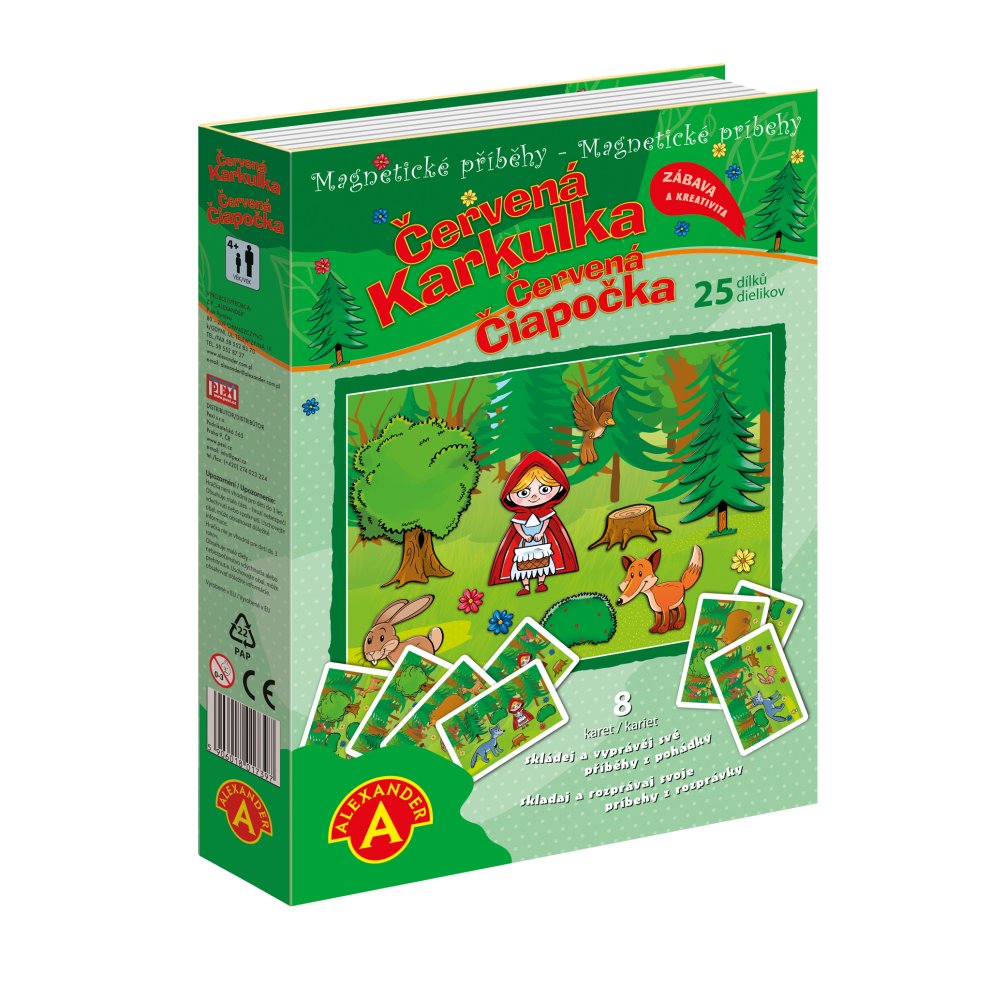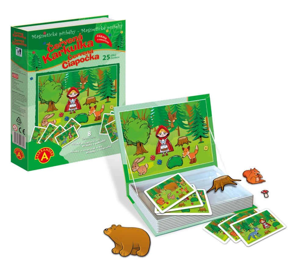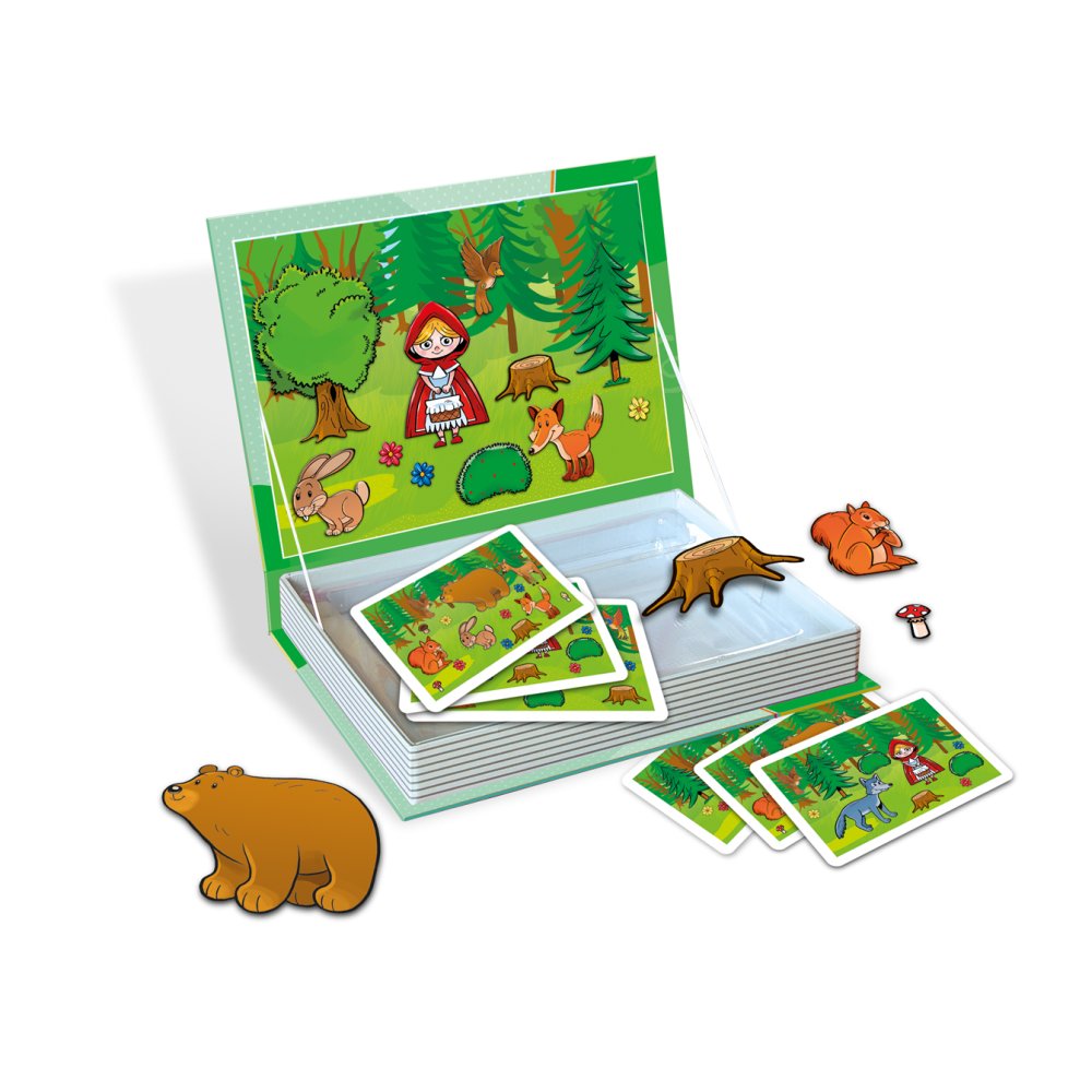 Zahrajte si vlastní příběhy s pohádkovými postavami. Magnetická vzdělávací hra ve formě knížky, pro děti od 4 let. Rozvíjí nejen jemnou motoriku a představivost, ale také probouzí fantazii a při popisování příběhů a zlepšuje vyjadřovací schopnosti. Hra obsahuje magnetické pozadí, na který děti skládají obrázkové magnetky, podle vzoru na kartičkách, které jsou součástí balení. Hra funguje i jako magnetické divadlo, kde si děti mohou také vytvářet vlastní kombinace a příběhy, které pak vypráví svým rodičům nebo učitelům. Tato hra rozvíjí nejen jemnou motoriku a představivost, ale také probouzí fantazii a při popisování příběhů a zlepšuje vyjadřovací schopnosti.