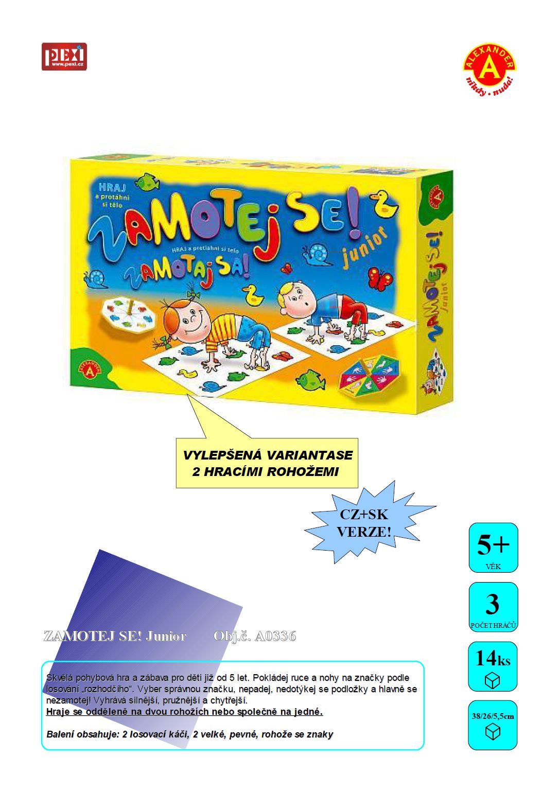 Zahraj si a protáhni si tělo. Hlavně se nezamotej! Skvělá pohybová zábava pro 3 velké i malé hráče od 5 do 12 let, která prověří vytrvalost, tělesnou zdatnost i mazanost. Skvělá zábava na ven i na doma. Roztáčej dvě káči se symboly a pokládej ruce a nohy na obrázky podle pokynů "rozhodčího". Protahuješ a procvičuješ své tělo. Vyhrává ten ohebnější s větší rovnováhou. Dva hráči cvičí na dvou rohožích současně a přesouvají ruce a nohy podle pokynů rozhodčího, který roztáčí káču s obrázky. Položíš ruku na žlutou kačenku nebo raději zvolíš nohu? Důležité je abys to ustál a vydržel déle než soupeř. Hru můžeš hrát na dvou nebo i na jedné rohoži. Na jedné rohoži je hra těžší než na dvou, kdy hráči hrají odděleně a plní stejné pokyny. Hra je určená pro pro 3 hráče od 5 nebo 6 let výše.