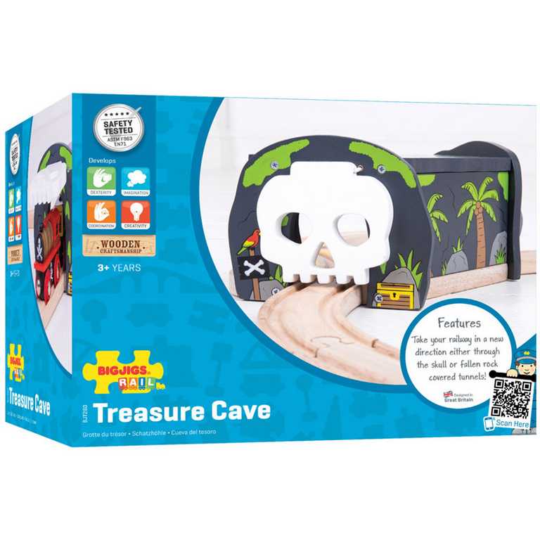 Dřevěný tunel jeskyně lebka - dva vchody nebo východy tunelu. Lebky jsou na provázku, jsou tedy otevírací. Podporuje představivost, zručnost a koordinaci. Většina ostatních hlavních značek dřevěných železnic je kompatibilní s Bigjigs Rail.