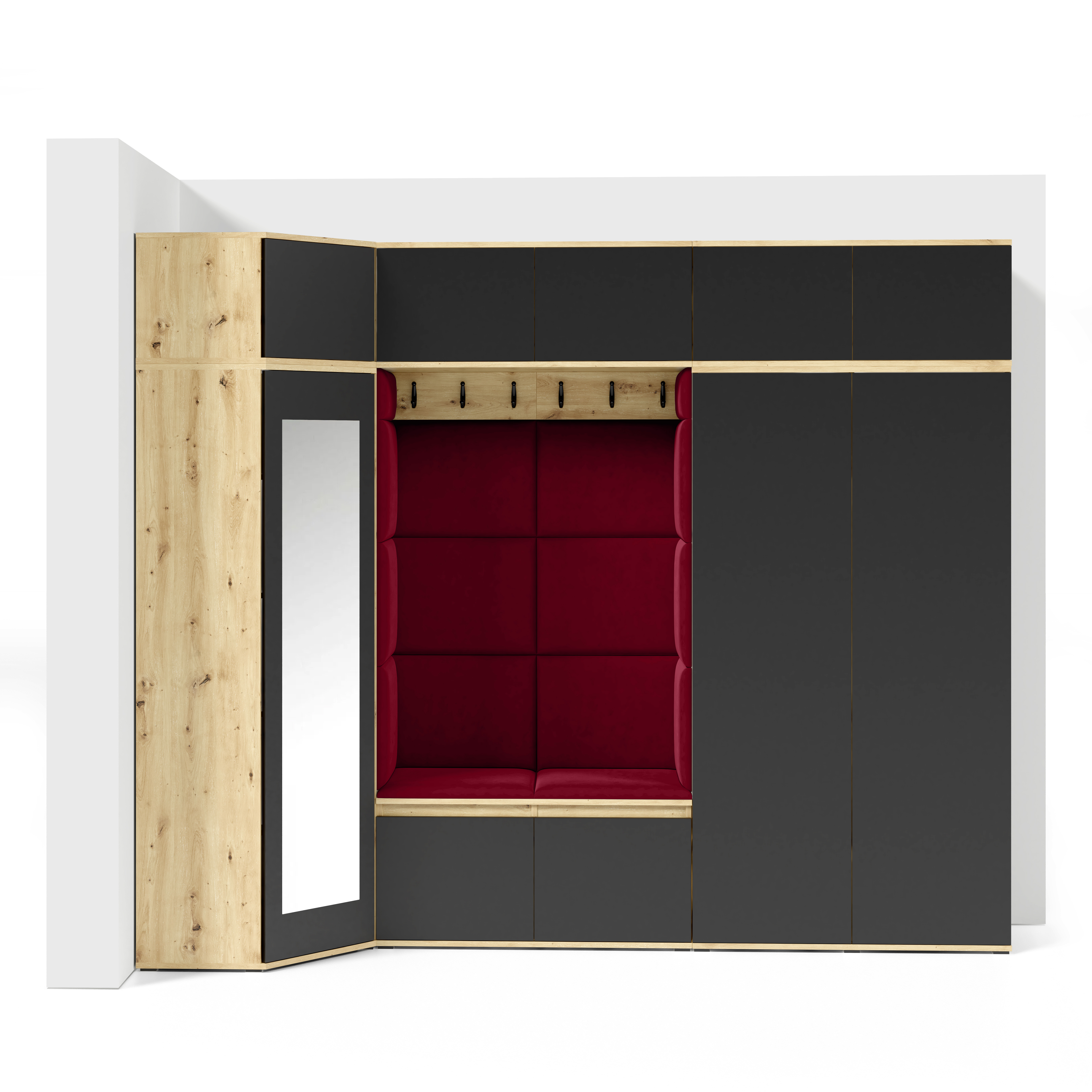 Eka Předsíňová stěna s čalouněnými panely Trinity 39 - Dub Artisan s černou / Rubínová 2324