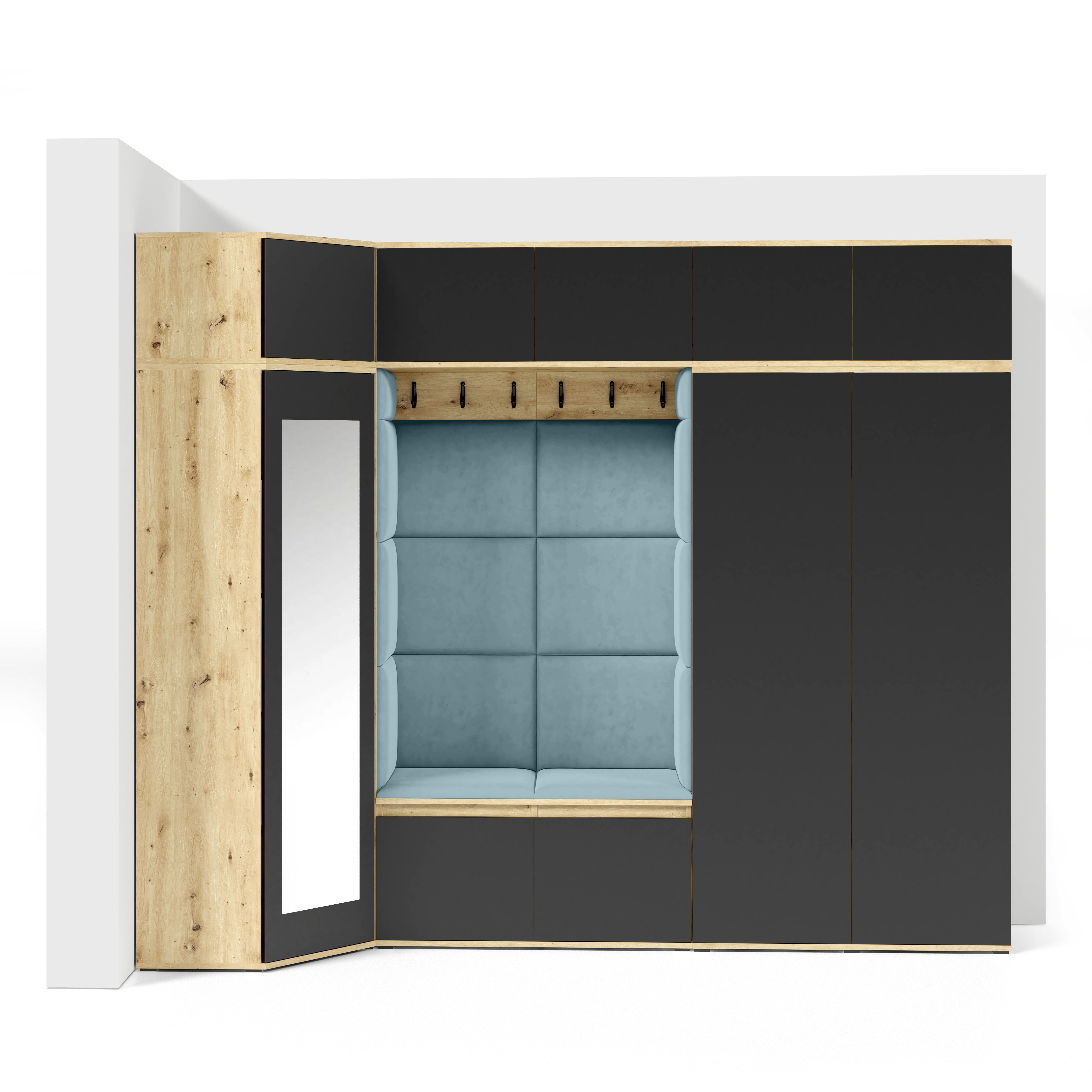 Eka Předsíňová stěna s čalouněnými panely Trinity 39 - Dub Artisan s černou / Světlá modrá 2322