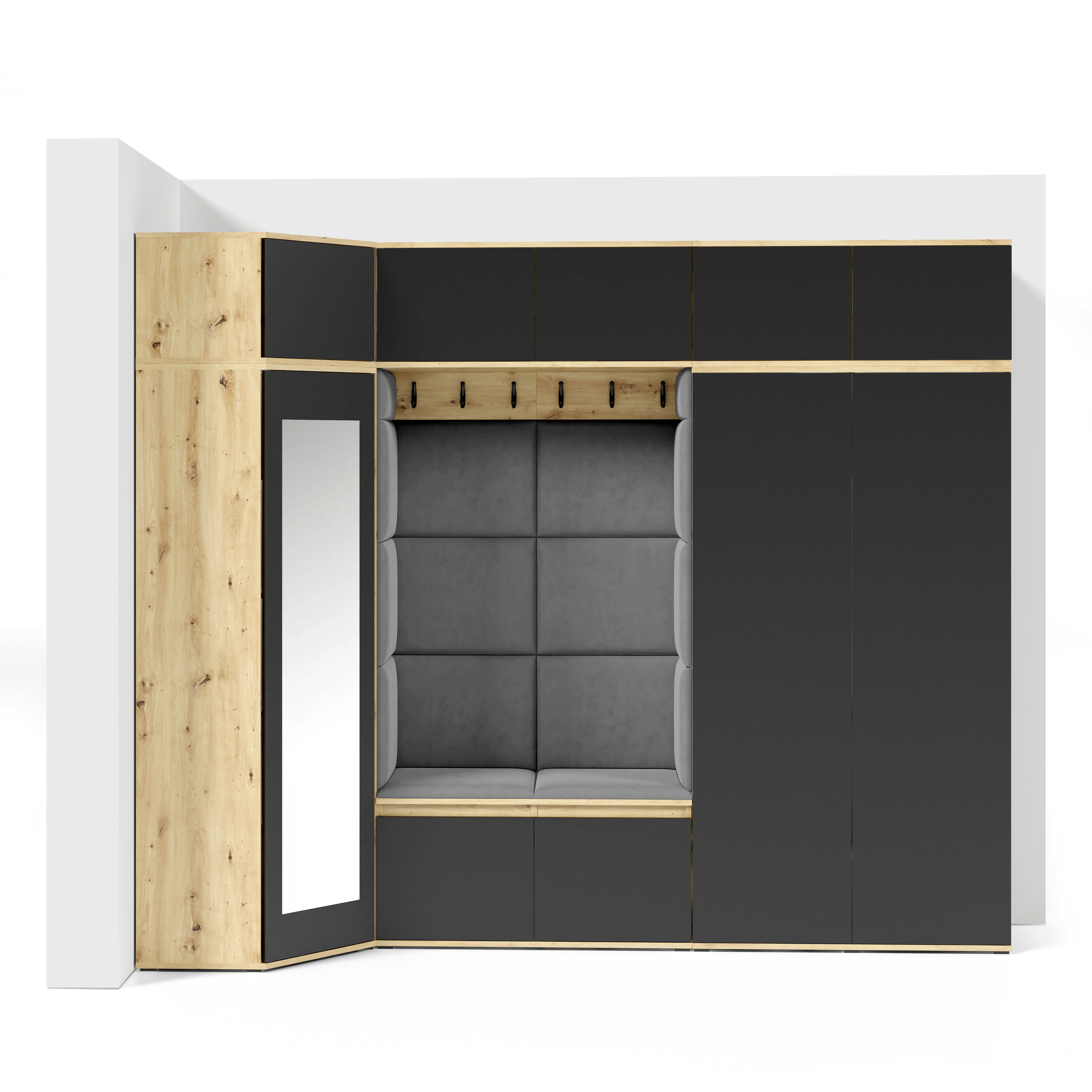 Eka Předsíňová stěna s čalouněnými panely Trinity 39 - Dub Artisan s černou / Šedá 2314