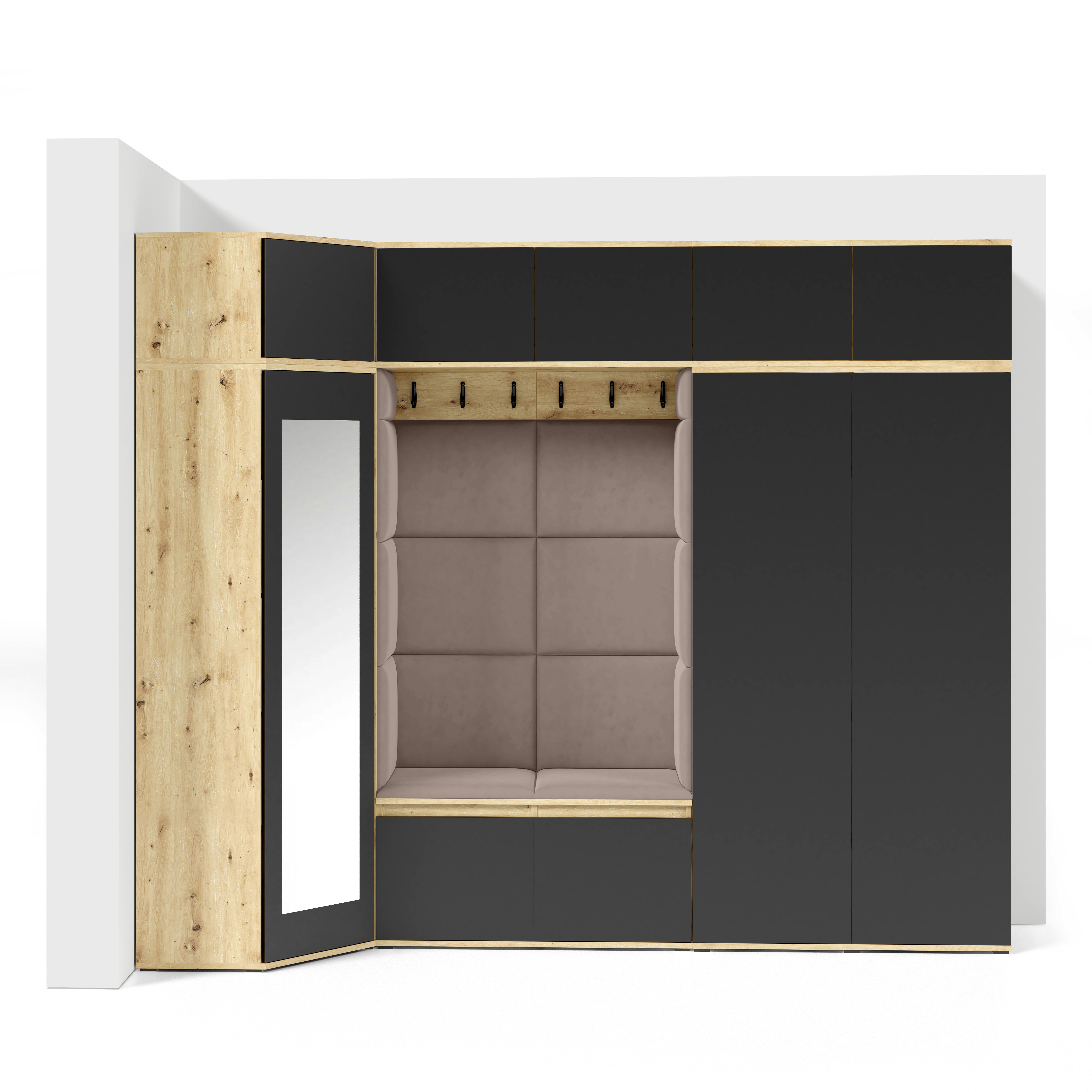Eka Předsíňová stěna s čalouněnými panely Trinity 39 - Dub Artisan s černou / Tmavá béžová 2305