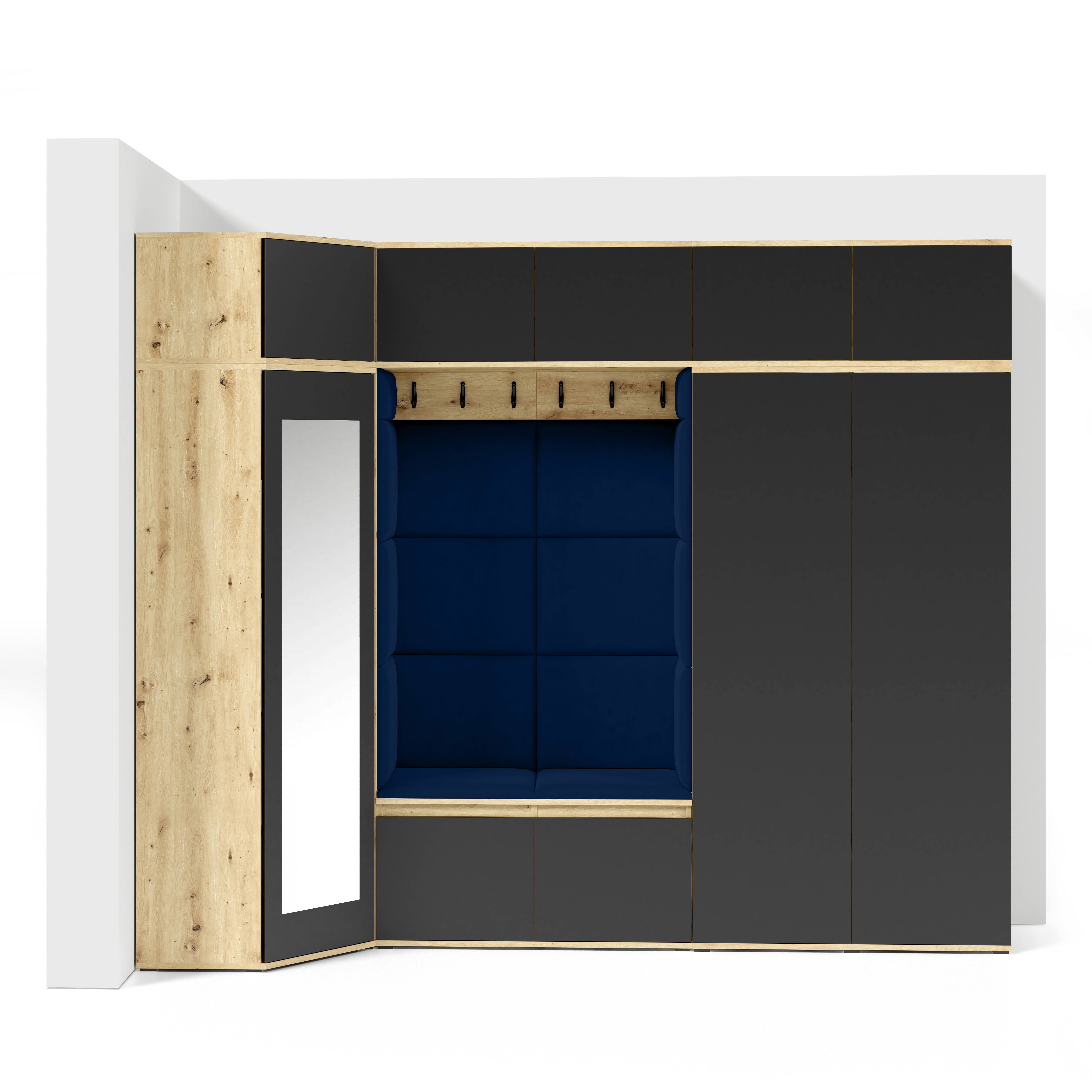 Eka Předsíňová stěna s čalouněnými panely Trinity 39 - Dub Artisan s černou / Tmavá modrá 2331