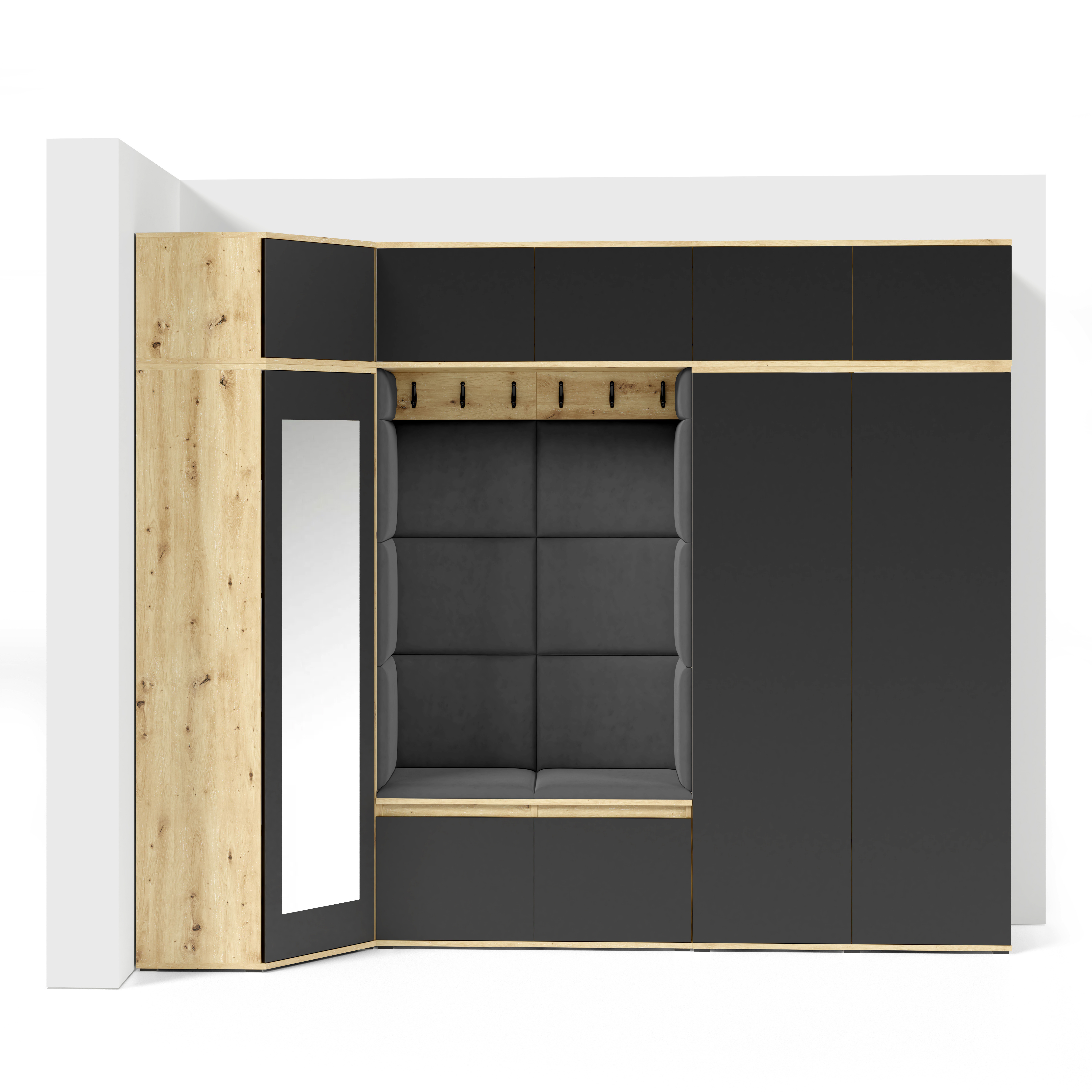 Eka Předsíňová stěna s čalouněnými panely Trinity 39 - Dub Artisan s černou / Tmavá šedá 2315