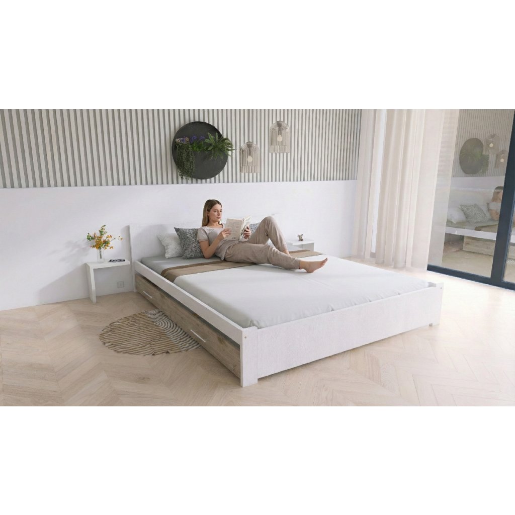 Postel IRIS a postel IRIS DOUBLE nabízí perfektní rovnováhu mezi přírodní pevností a moderním stylem. Má pevný rám z masivní borovice, který zajišťuje stabilitu a dlouhou životnost. Čela jsou vyrobená z kvalitní dřevotřískové desky s odolným povrchem, který se snadno udržuje. Vybereš si jemnou bílou s dekorem dubu, nebo odvážnou kombinaci grafitu a dřeva? Ať už sháníš postel do dětského pokoje, penzionu nebo ložnice pro dva, postel IRIS se přizpůsobí tvým potřebám.Masivní krása bez kompromisů